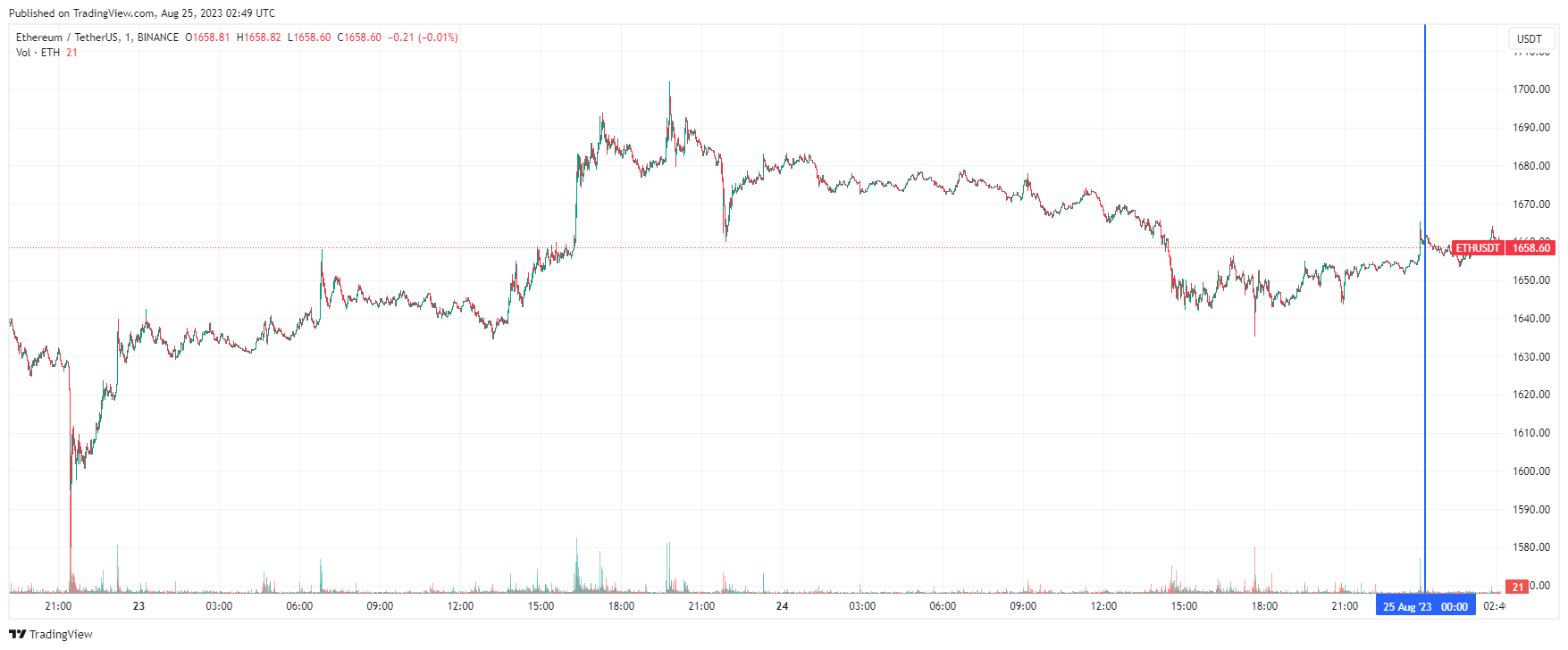 Вторая по капитализации криптовалюта Ethereum также начала день с боковика. По состоянию на момент написания обзора, монета торгуется по $1658 (1 токен в рублях — ₽156,716).