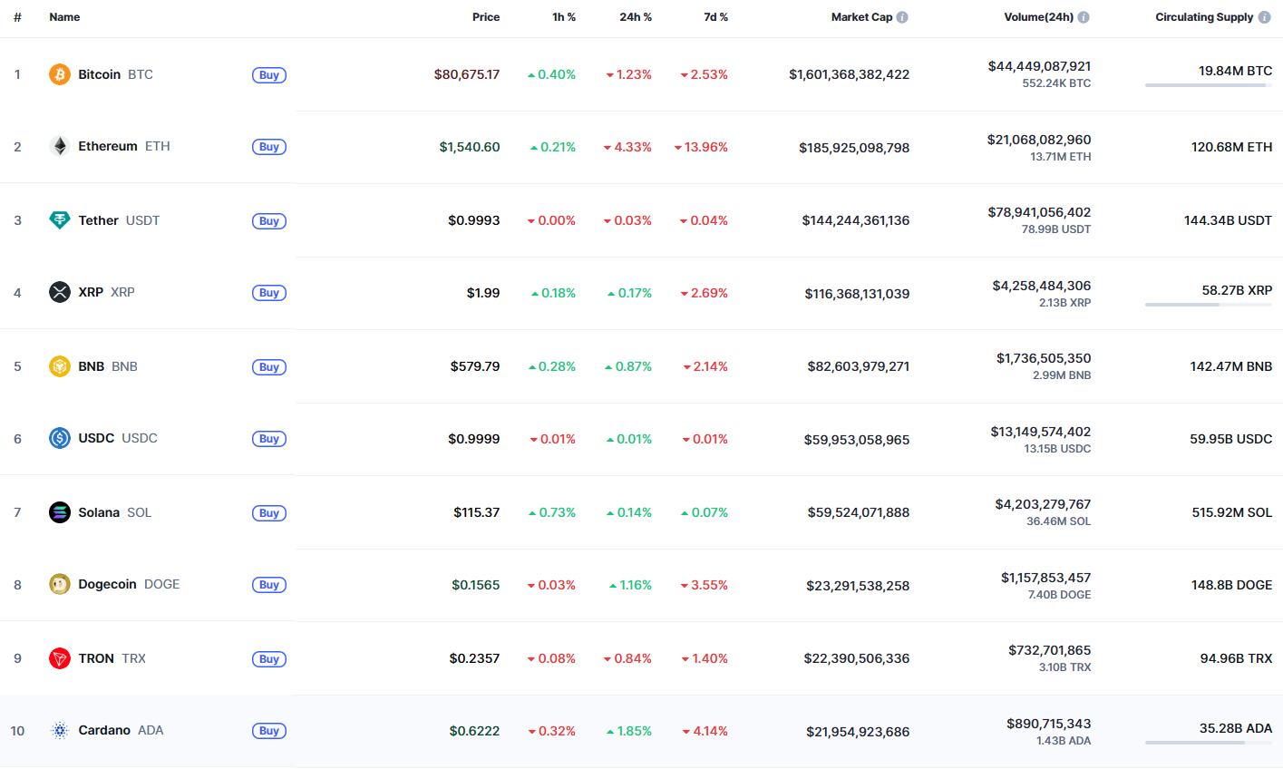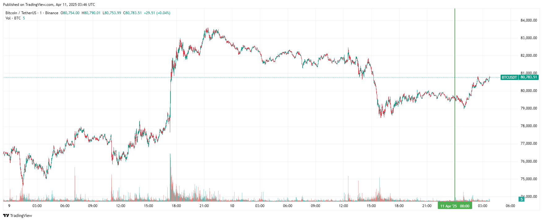 Биткоин (BTC), по данным ресурса TradingView, начал пятницу с небольшого роста. По состоянию на 06:47 (МСК), криптовалюта торгуется по $80 783 (1 токен в рублях — RUB 6 741 638). Минимум биткоина за 24 часа — $78 456, максимум — $82 338.