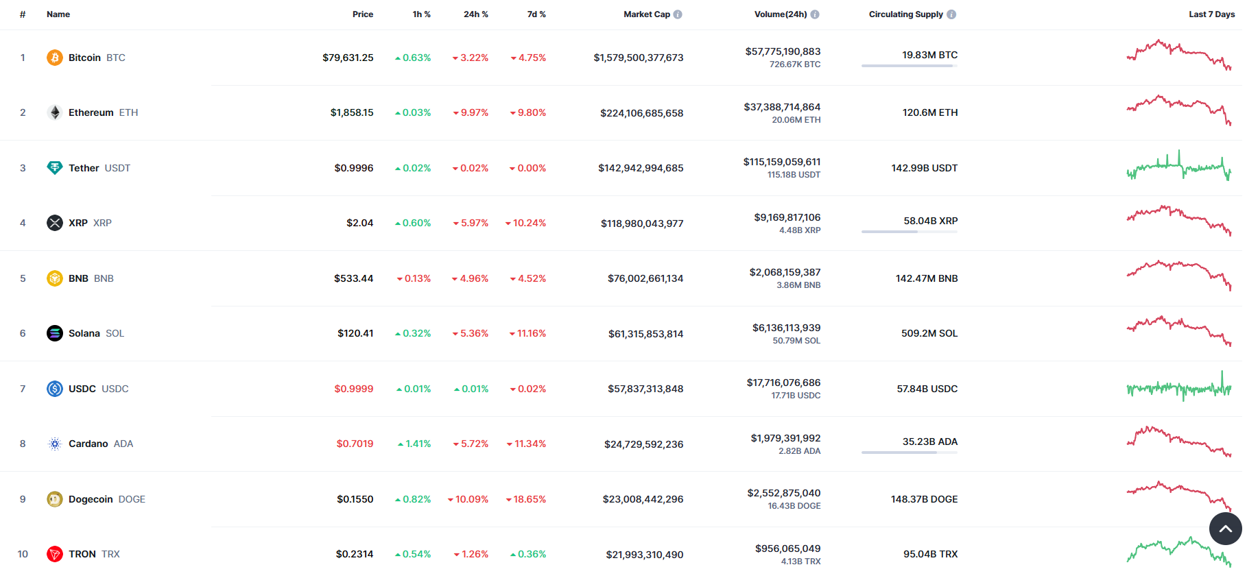 В топ-10 самых капитализированных криптовалют все монеты, за исключением стейблкоина USDC, падали на протяжении 24 часов. Худший результат за сутки — у Dogecoin (-10,09%). Также монета активнее других падала на протяжении недели (-18,65%). Лучший результат за семь дней — у TRON (-0,36%).