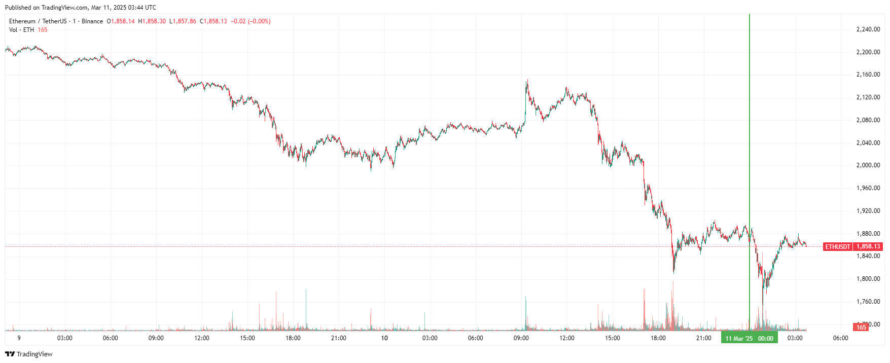 Вторая по капитализации криптовалюта Ethereum также начала день с падения с последующим восстановлением. По состоянию на момент написания обзора, монета торгуется по $1 858 (1 токен в рублях — RUB 162 604).