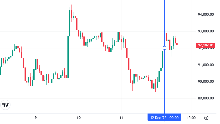 Биткоин (BTC), по данным ресурса TradingView, начал пятницу с бокового движения. По состоянию на 07:27 (МСК), криптовалюта торгуется по $92 182 (1 токен в рублях — ₽7 308 411). Минимум биткоина за 24 часа — $89 335, максимум — $93 554.