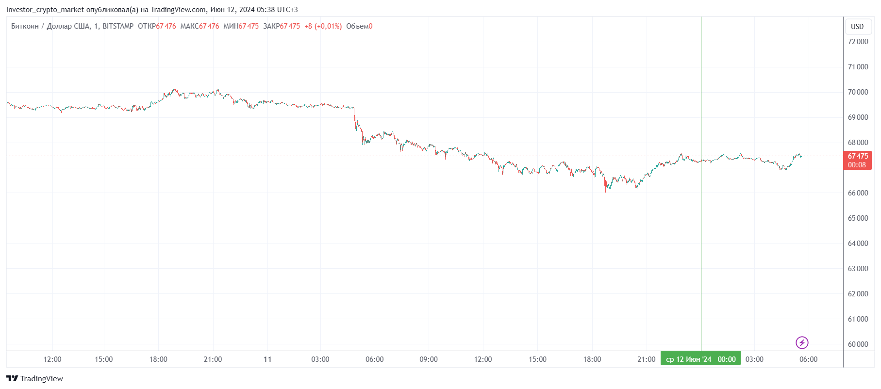 Биткоин (BTC), по данным ресурса TradingView, начал среду с бокового движения. По состоянию на 05:39 (МСК), криптовалюта торгуется по $67 475 (1 токен в рублях — ₽6 012 656). Минимум биткоина за 24 часа — $66 123, максимум — $68 444.