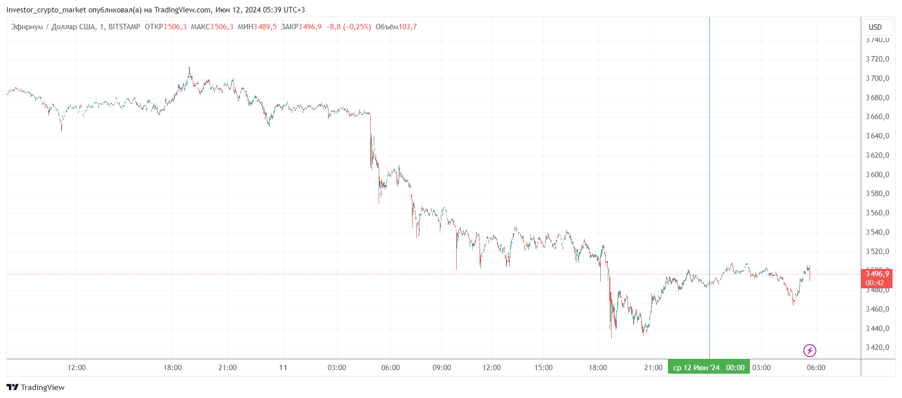 Вторая по капитализации криптовалюта Ethereum также начала день с бокового движения. По состоянию на момент написания обзора, монета торгуется по $3 496 (1 токен в рублях — ₽311 746).