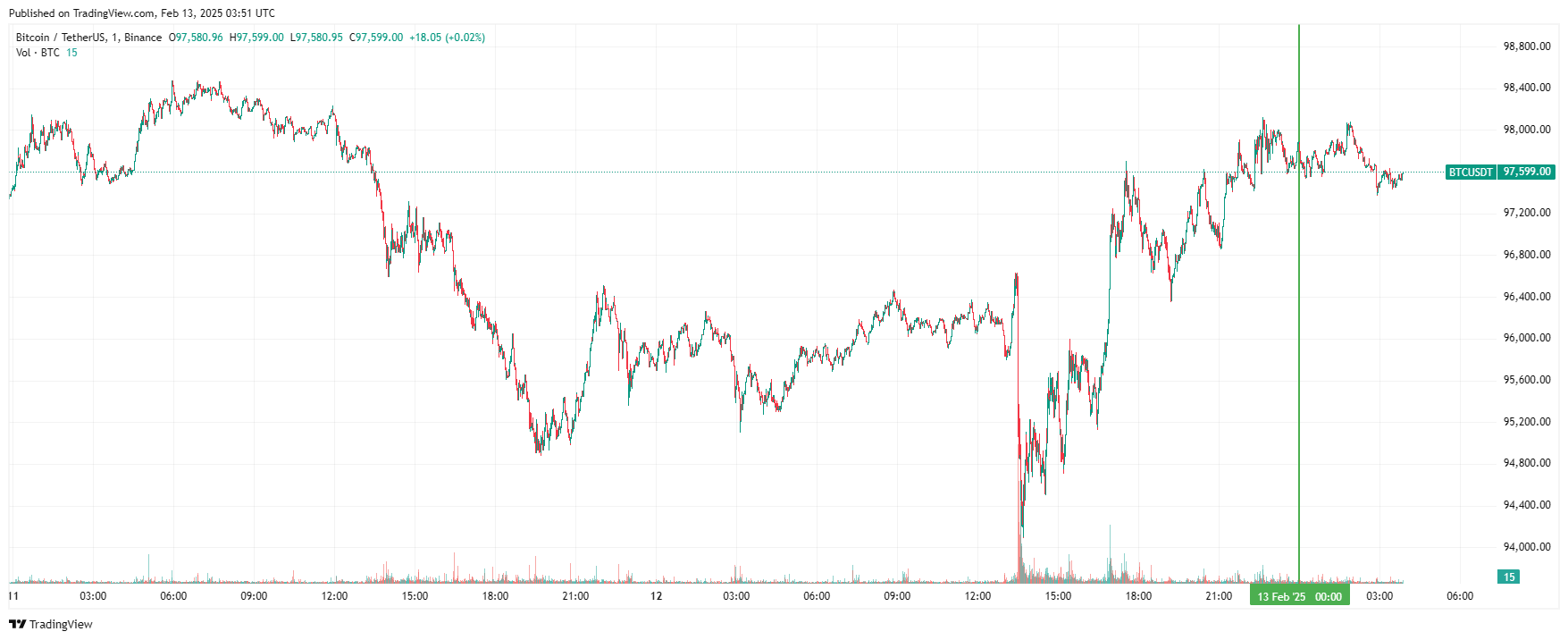 Биткоин (BTC), по данным ресурса TradingView, начал четверг с бокового движения. По состоянию на 06:52 (МСК), криптовалюта торгуется по $97 599 (1 токен в рублях — RUB 9 166 668). Минимум биткоина за 24 часа — $94 101, максимум — $98 151.