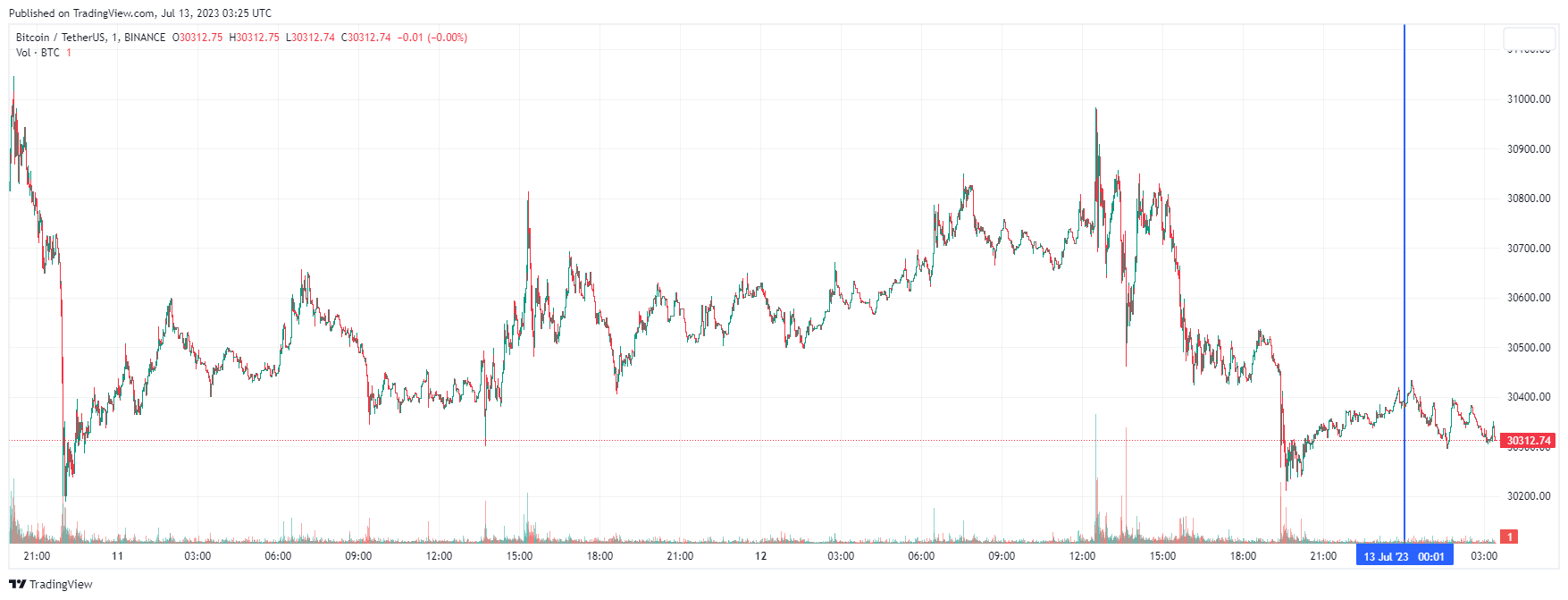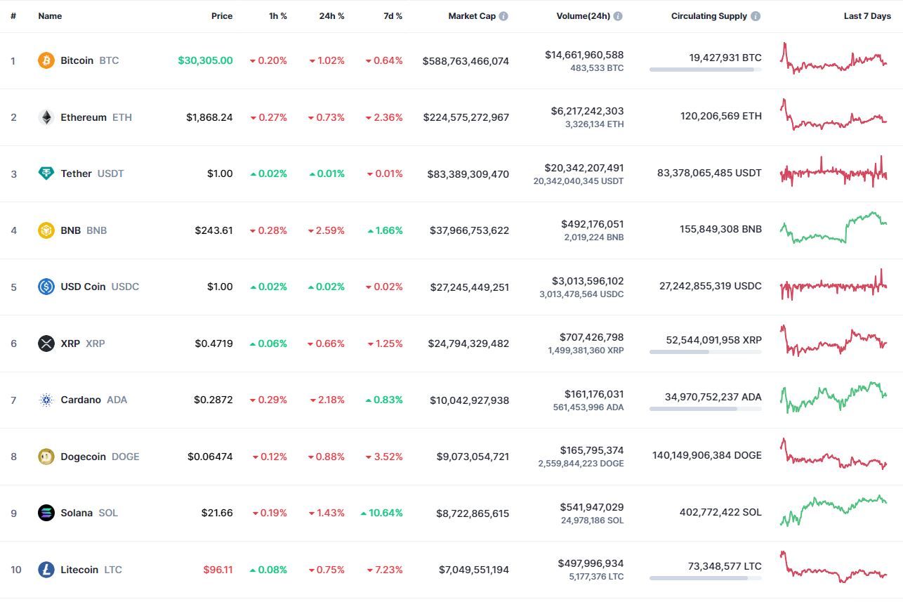 Биткоин (BTC), по данным ресурса CoinMarketCap, начал четверг с бокового движения. По состоянию на 06:26 (МСК), криптовалюта торгуется по $30 312 (1 токен в рублях — ₽2,741,343). Минимум биткоина за 24 часа — $30 228, максимум — $30 959.