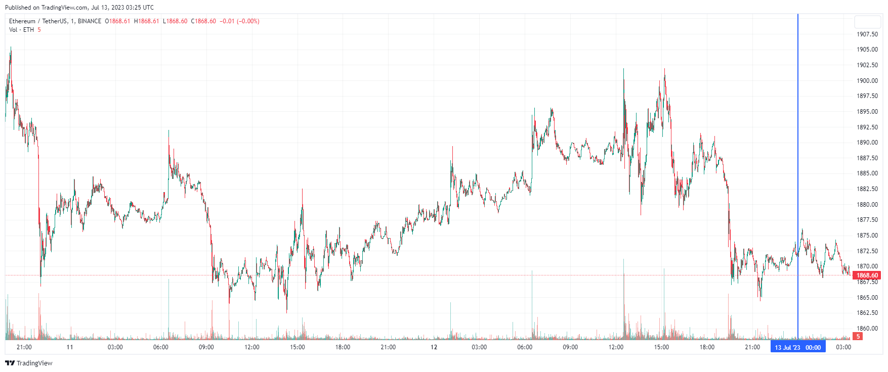 Вторая по капитализации криптовалюта Ethereum также начала день с бокового движения. По состоянию на момент написания обзора, монета торгуется по $1868 (1 токен в рублях — ₽168,973).