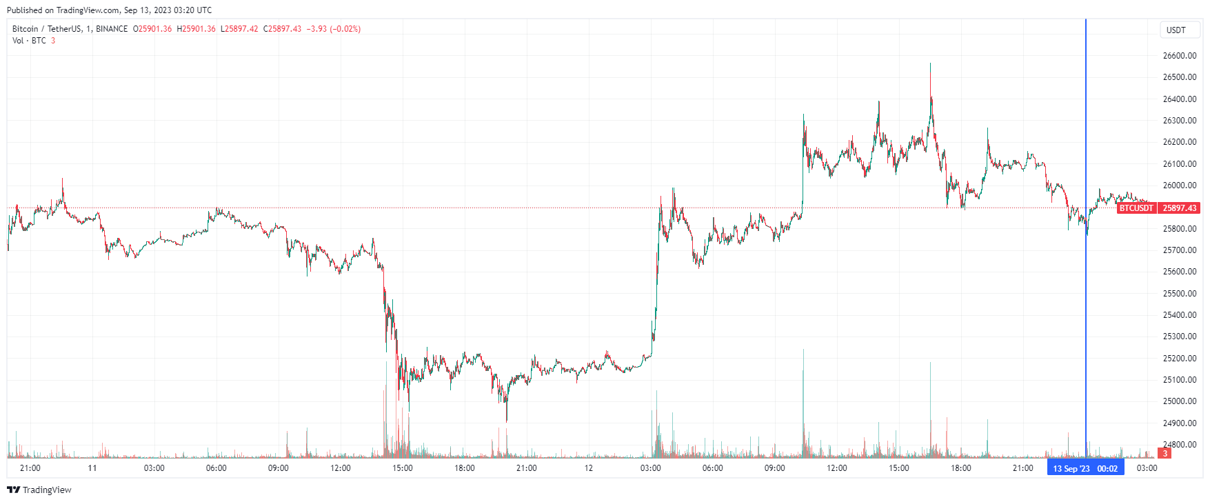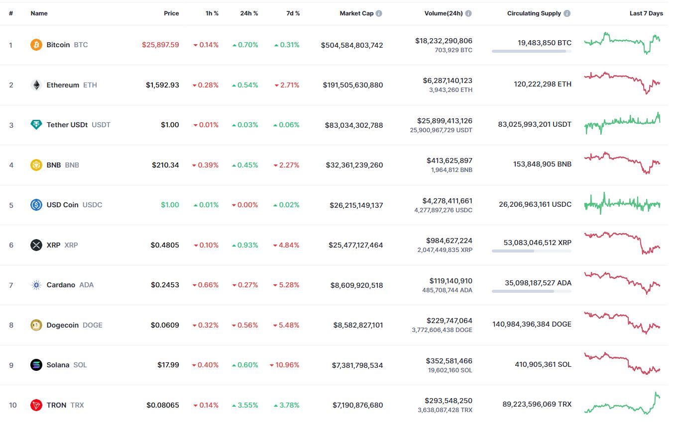 Биткоин (BTC), по данным ресурса CoinMarketCap, начал среду с бокового движения. По состоянию на 06:21 (МСК), криптовалюта торгуется по $25 897 (1 токен в рублях — ₽2,453,361). Минимум биткоина за 24 часа — $25 203, максимум — $26 451.