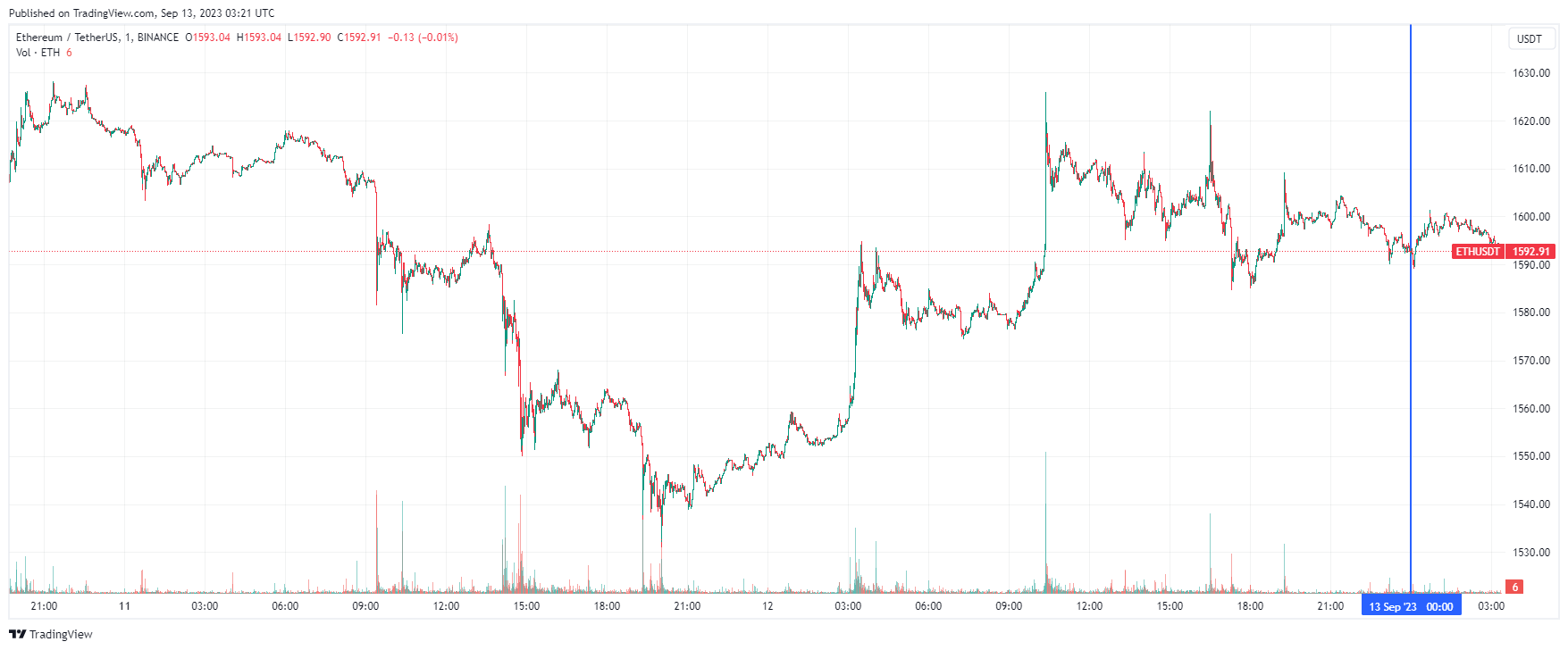 Вторая по капитализации криптовалюта Ethereum также начала день с бокового движения. По состоянию на момент написания обзора, монета торгуется по $1592 (1 токен в рублях — ₽150,836).