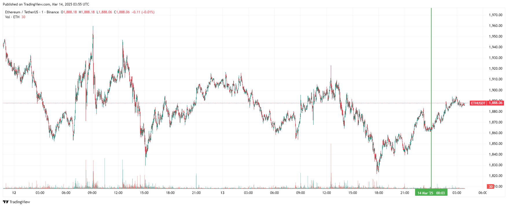 Вторая по капитализации криптовалюта Ethereum также начала день с небольшого роста. По состоянию на момент написания обзора, монета торгуется по $1 888 (1 токен в рублях — RUB 163 023).