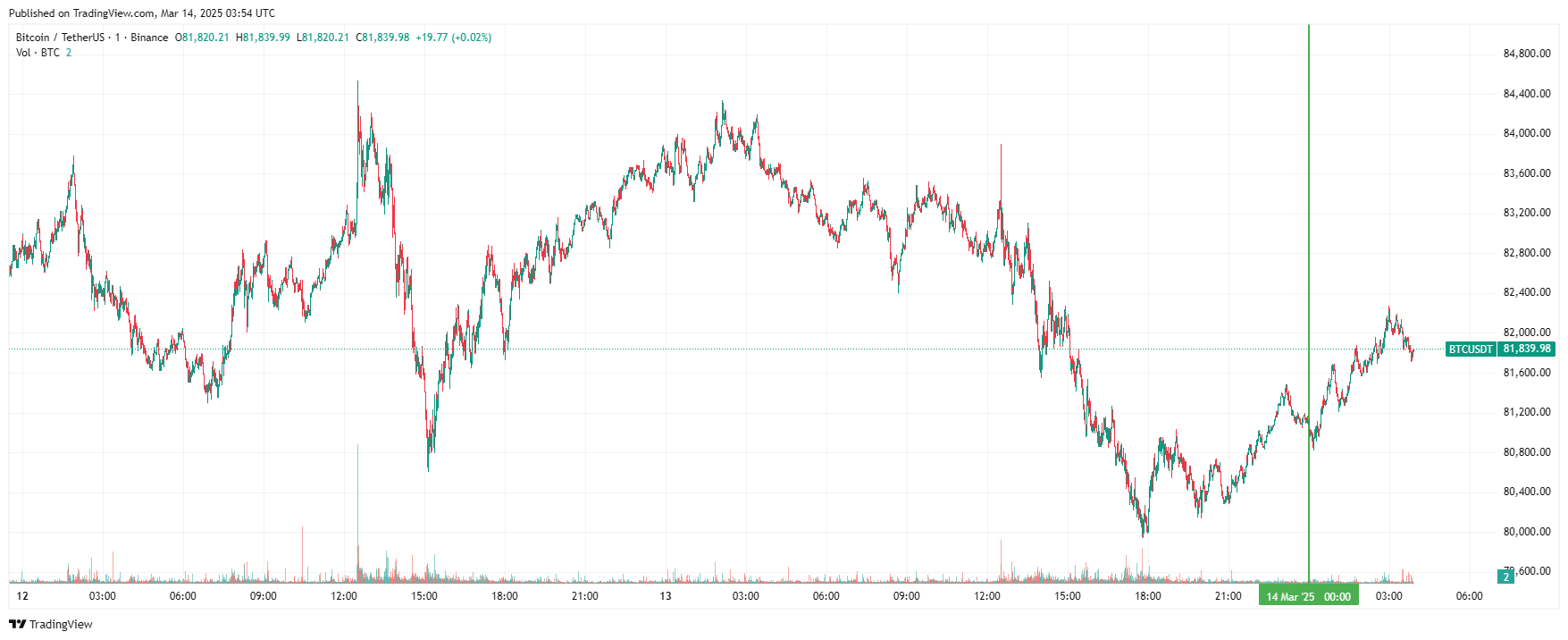Биткоин (BTC), по данным ресурса TradingView, начал пятницу с небольшого роста. По состоянию на 06:55 (МСК), криптовалюта торгуется по $81 839 (1 токен в рублях — RUB 7 068 752). Минимум биткоина за 24 часа — $79 931, максимум — $83 736.