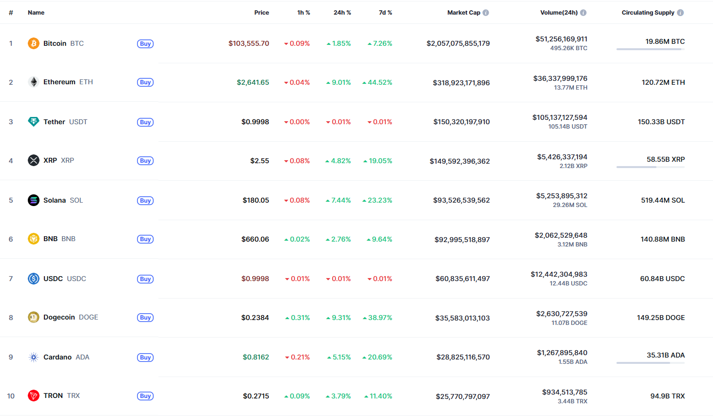 В топ-10 самых капитализированных криптовалют лучший результат за сутки — у Dogecoin (+9,31%), за неделю — у Ethereum (+44.52%). На протяжении 24 часов и семи дней все критовалюты, за исключением стейблкоинов, росли.