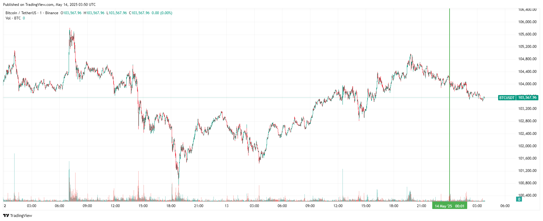 Биткоин (BTC), по данным ресурса TradingView, начал день со снижения. На момент написания обзора, 06:51 (МСК), криптовалюта торгуется по $103 567 (1 токен в рублях — RUB 8 268 214). Минимум биткоина за 24 часа — $101 677, максимум — $104 997.