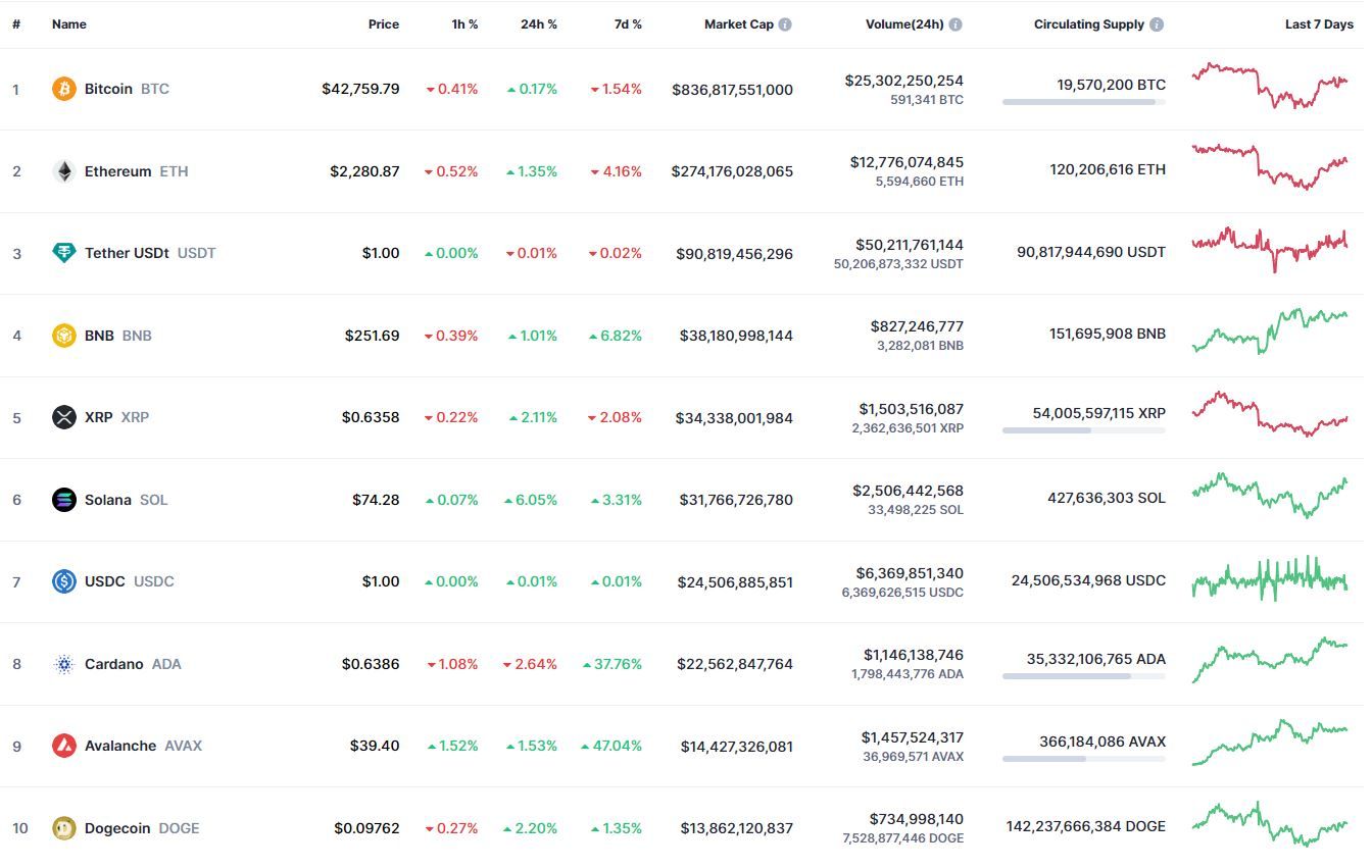 Биткоин (BTC), по данным ресурса TradingView, начал пятницу с небольшого снижения. По состоянию на 06:46 (МСК), криптовалюта торгуется по $42 788 (1 токен в рублях — ₽3,831,459). Минимум биткоина за 24 часа — $41 767, максимум — $43 390.