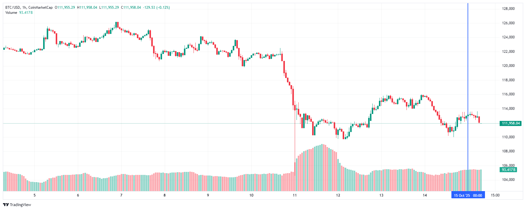 Биткоин (BTC), по данным ресурса TradingView, начал среду с падения. По состоянию на 07:12 (МСК), криптовалюта торгуется по $111 959 (1 токен в рублях — ₽8 911 530). Минимум биткоина за 24 часа — $110 029, максимум — $113 705.
