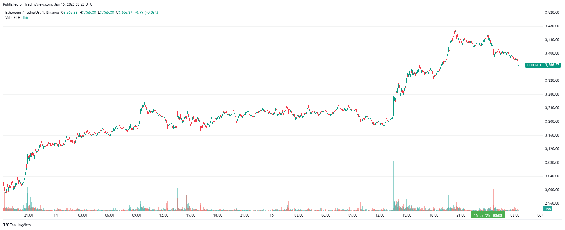 Вторая по капитализации криптовалюта Ethereum также начала день с небольшого снижения. На момент написания обзора монета торгуется по $3 363 (1 токен в рублях — ₽344 200).