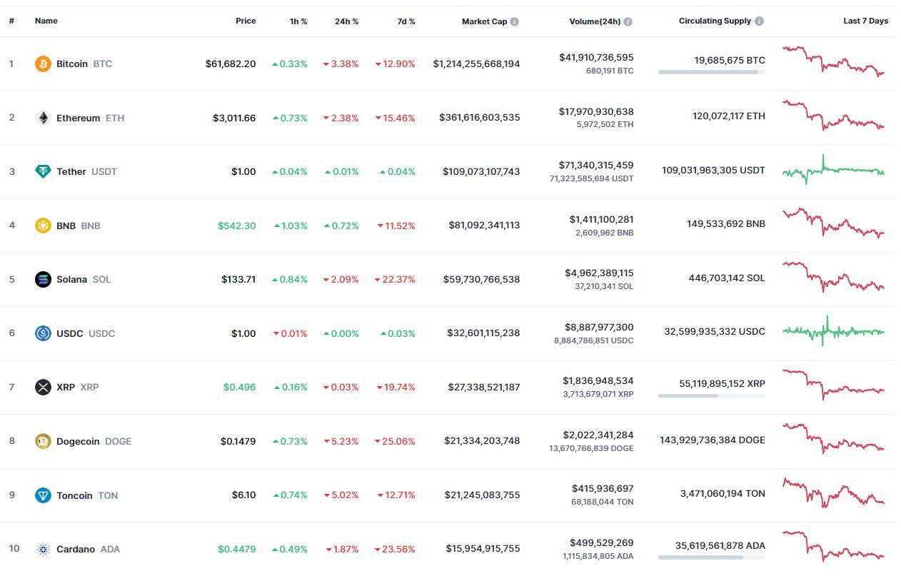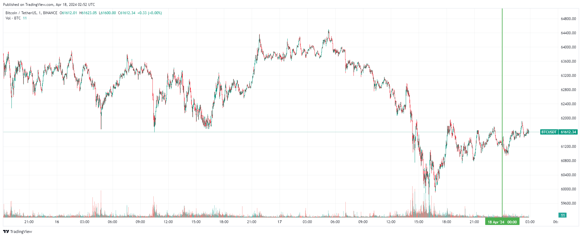 Биткоин (BTC), по данным ресурса TradingView, начал четверг с падения, которое перешло в восстановление. По состоянию на 05:53 (МСК), криптовалюта торгуется по $61 612 (1 токен в рублях — ₽5,801,092). Минимум биткоина за 24 часа — $59 768, максимум — $64 486.
