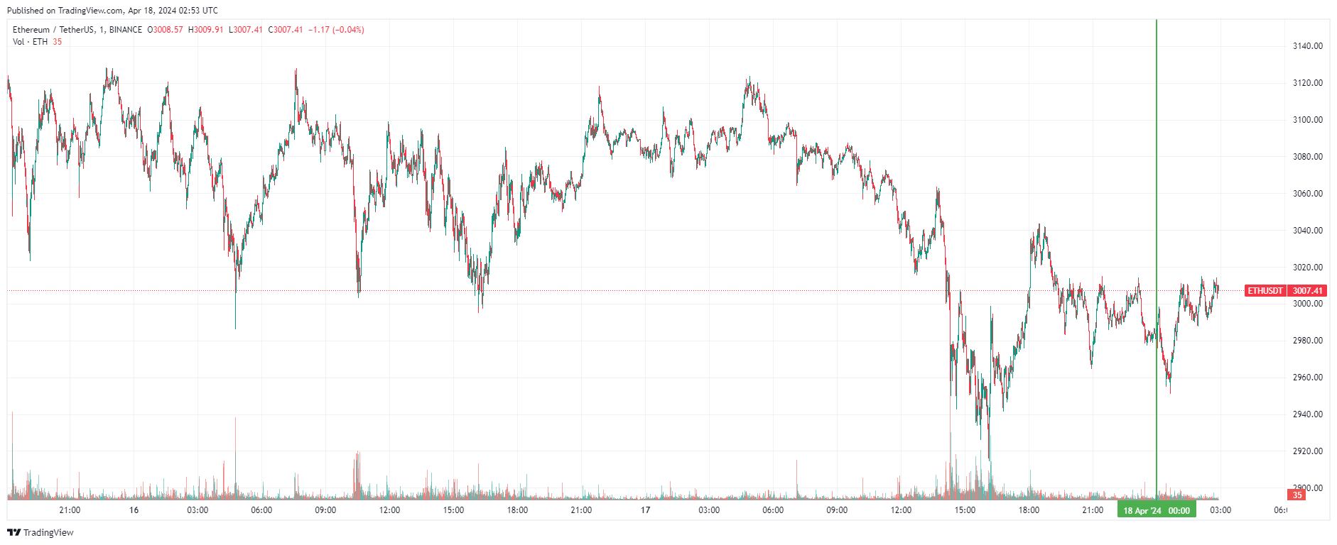 Вторая по капитализации криптовалюта Ethereum также начала день с небольшого снижения с последующим восстановлением. По состоянию на момент написания обзора, монета торгуется по $3 007 (1 токен в рублях — ₽283,223).
