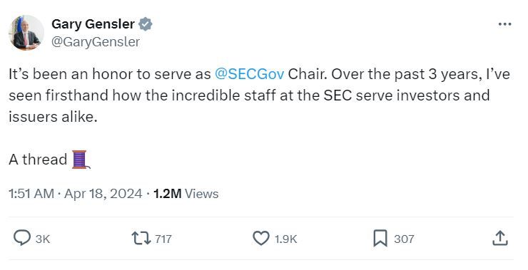 «Для меня было честью работать в качестве главы SEC. За последние три года я лично стал очевидцем того, как удивительная команда SEC работает с инвесторами и эмитентами», — говорится в стартовом посте треда Генслера.