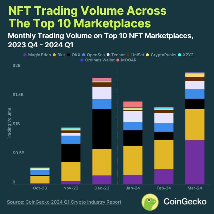 - Magic Eden впервые обошел Blur и стал крупнейшим NFT-маркетплейсом по итогам марта 2024 года. Об этом говорится в отчете CoinGecko за первый квартал.