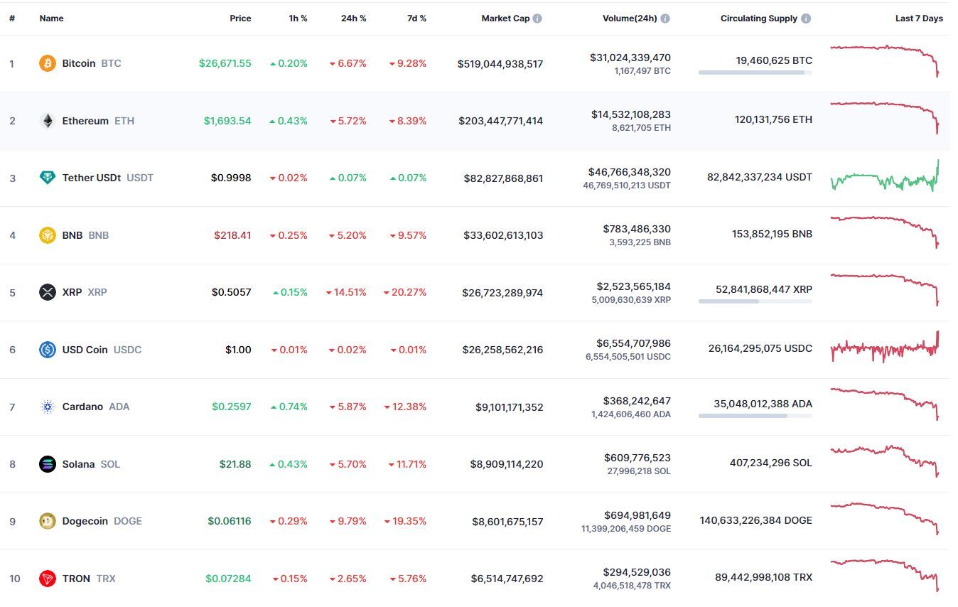 В топ-10 самых капитализированных криптовалют все монеты, за исключением стейблкоина Tether, продемонстрировали отрицательную динамику. Наибольшие потери за сутки (-14,51%) и неделю (-20,27%) зафиксированы у XRP.
