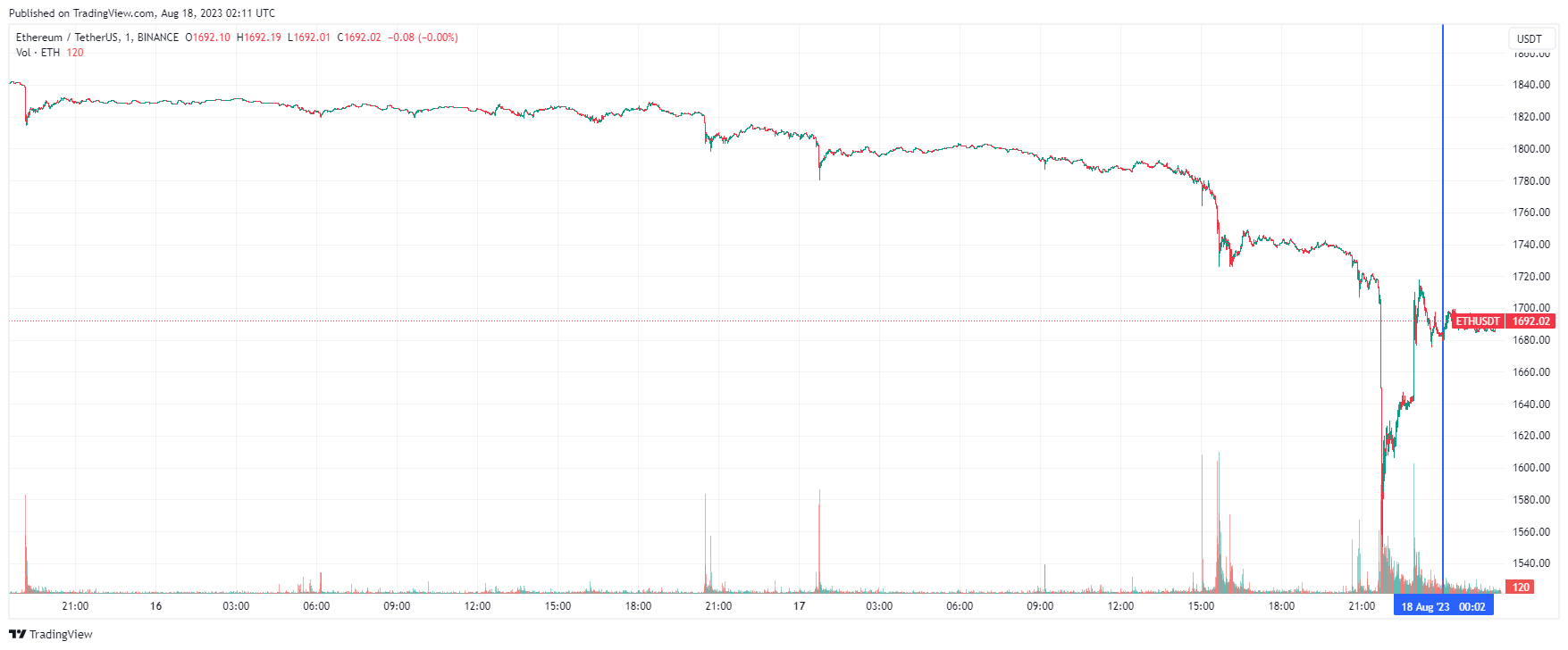 Вторая по капитализации криптовалюта Ethereum также начала день с боковика, которому предшествовал спуск. По состоянию на момент написания обзора, монета торгуется по $1692 (1 токен в рублях — ₽160,101).