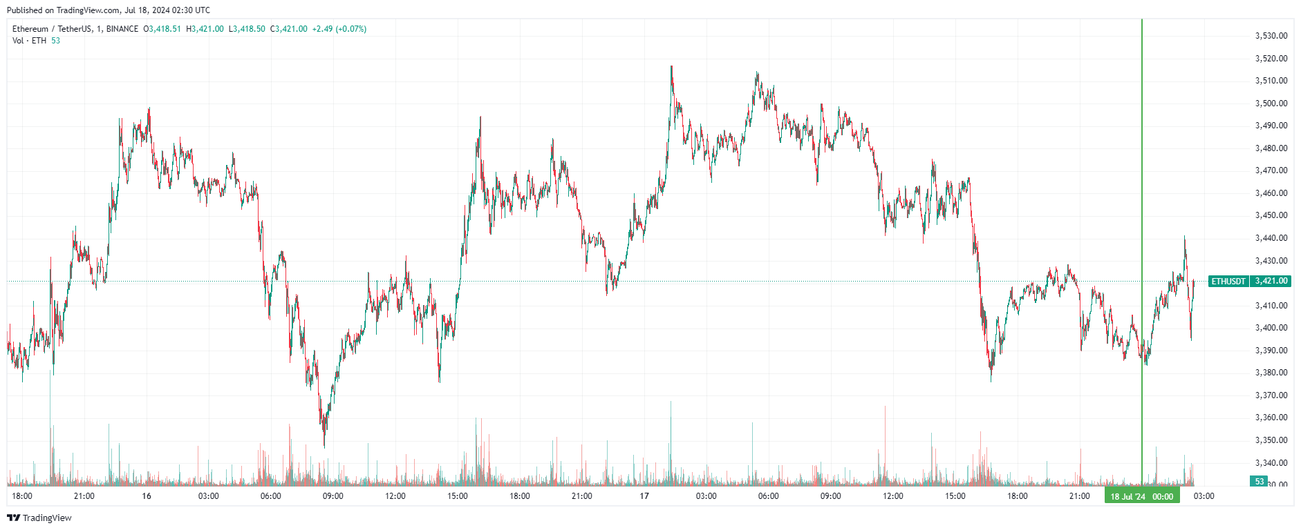 Вторая по капитализации криптовалюта Ethereum также начала день с небольшого роста. По состоянию на момент написания обзора, монета торгуется по $3 421 (1 токен в рублях — ₽302 523).