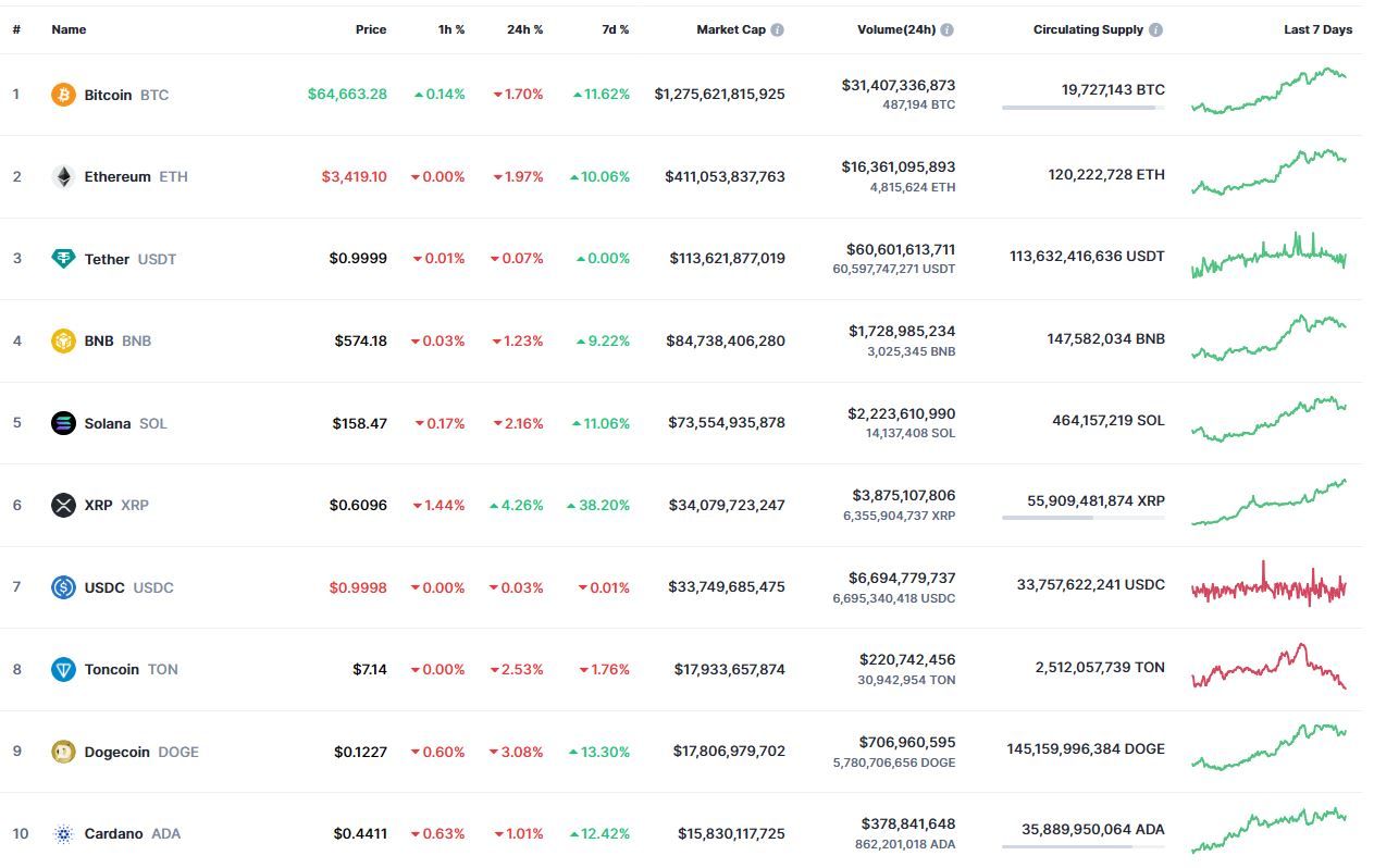 В топ-10 самых капитализированных криптовалют лучший результат за сутки (+4,26%) и неделю (+38,20%) зафиксирован у XRP. Активнее других в течение 24 часов терял в цене Dogecoin (-3,08%). Наибольшие потери за неделю зафиксированы у Toncoin (-1,76%).