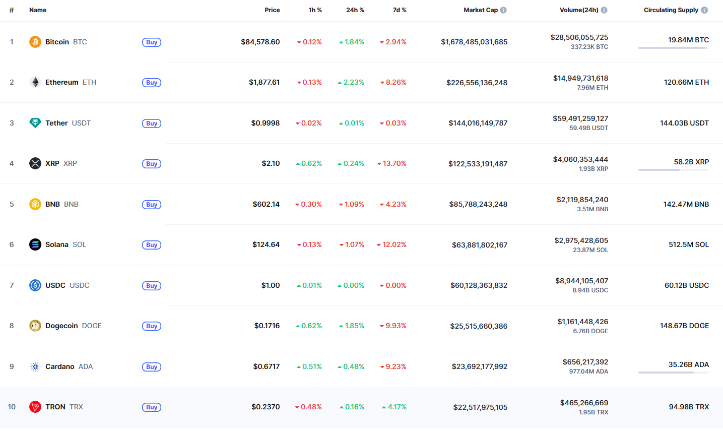 В топ-10 самых капитализированных криптовалют лучший результат за 24 часа — у Ethereum (+2,23%), за неделю — у TRON (+4,17%). Наибольшие потери за сутки зафиксированы у BNB (-1,09%), за семь дней — у Solana (-12,02%).