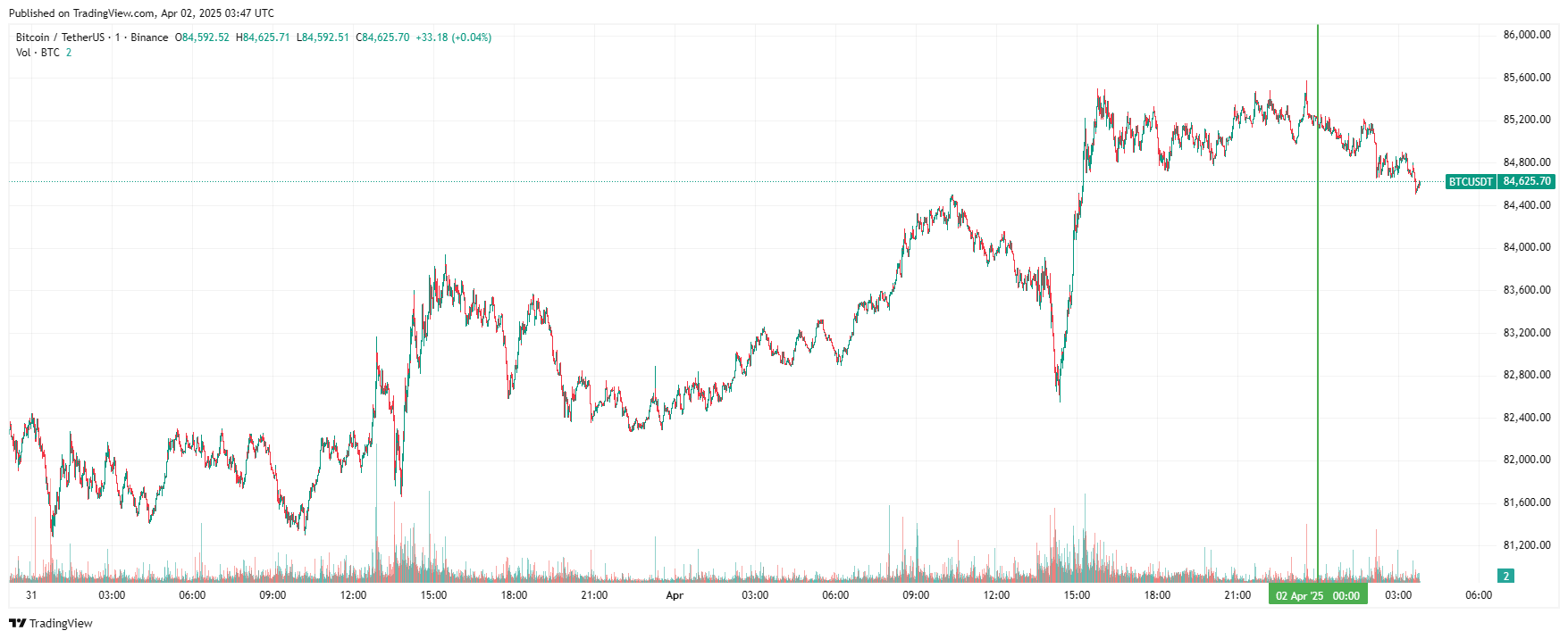 Биткоин (BTC), по данным ресурса TradingView, начал среду со снижения. По состоянию на 06:48 (МСК), криптовалюта торгуется по $84 625 (1 токен в рублях — 7 147 269 RUB). Минимум биткоина за 24 часа — $82 550, максимум — $85 487.