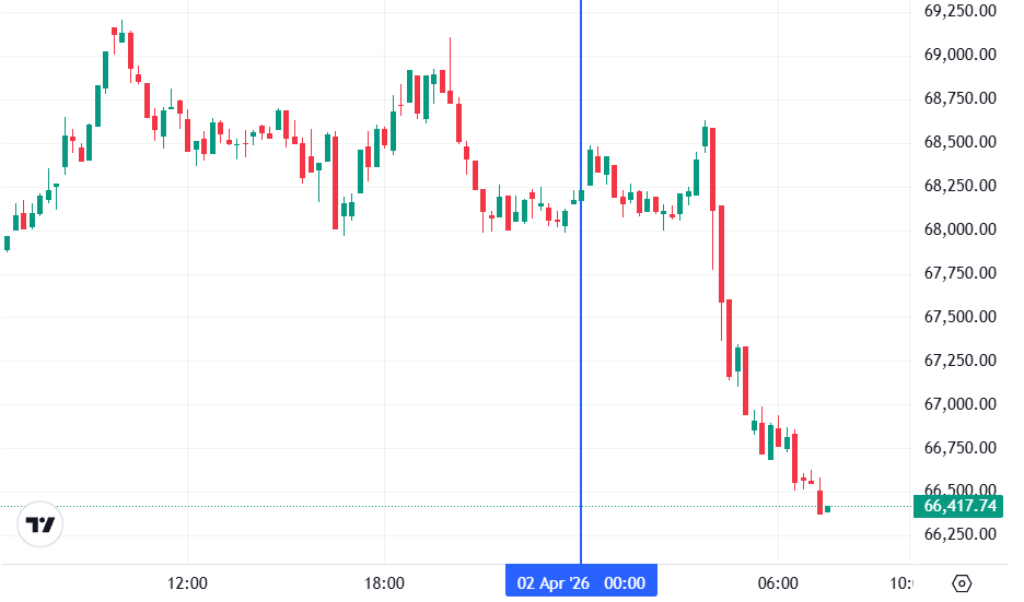 Биткоин (BTC), по данным ресурса TradingView, начал день с падения. По состоянию на 07:34 (МСК), криптовалюта торгуется по $66 417 (1 токен в рублях — ₽5 322 798). Минимум биткоина за 24 часа — $66 367, максимум — $69 230.