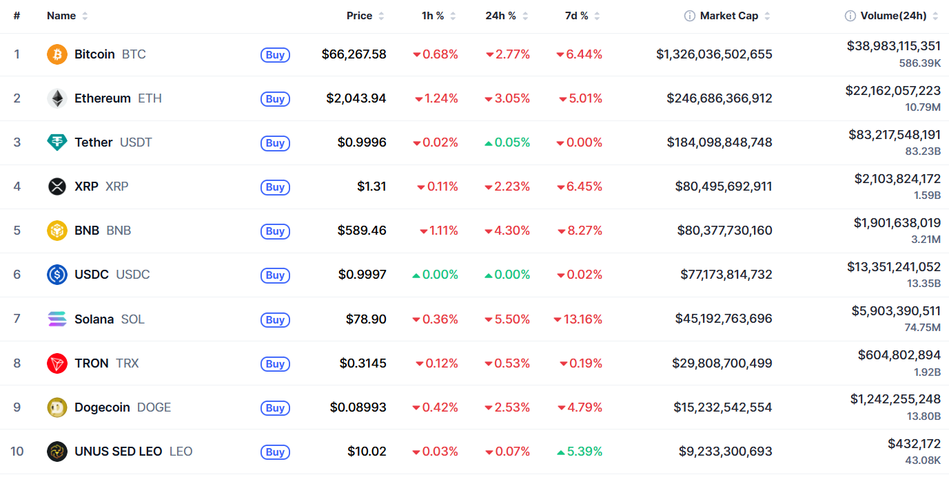 В топ-10 самых капитализированных криптовалют все монеты, за исключением стейблкоинов, падали в течение 24 часов. Наибольшие потери за сутки — у Solana (-5,50%). Также монета активнее других теряла в течение недели (-13,16%). Лучший результат за семь дней — у Unus Sed Leo (+5,39%) — новичка топ-10.