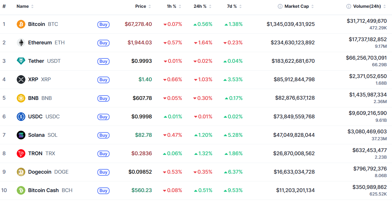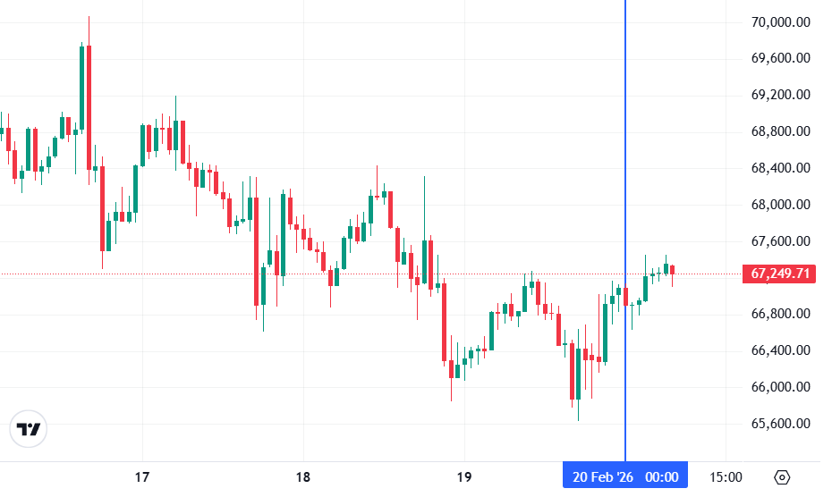 Биткоин (BTC), по данным ресурса TradingView, начал день с небольшого роста. По состоянию на 07:37 (МСК), криптовалюта торгуется по $67 249 (1 токен в рублях — ₽5 160 709). Минимум биткоина за 24 часа — $65 637, максимум — $67 456.