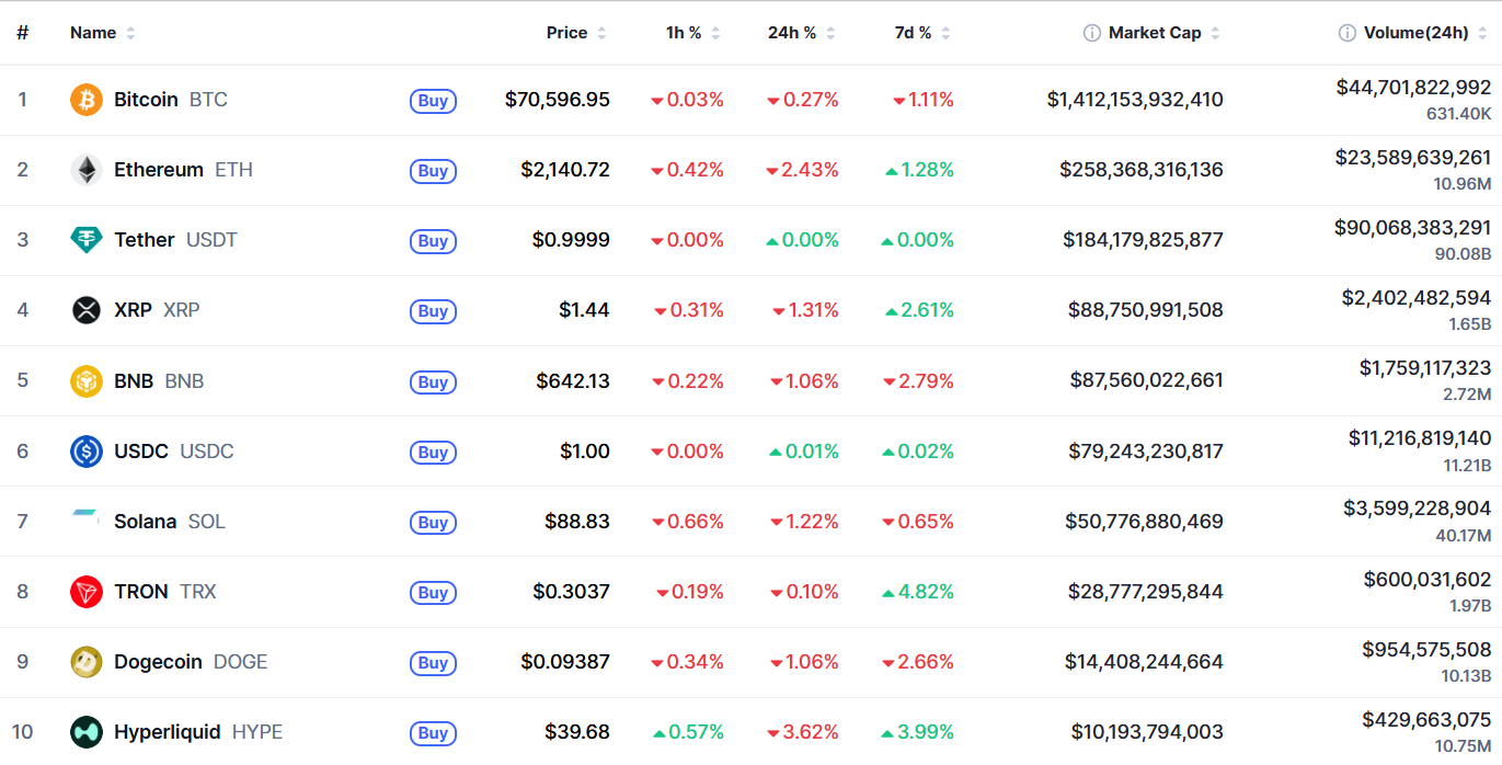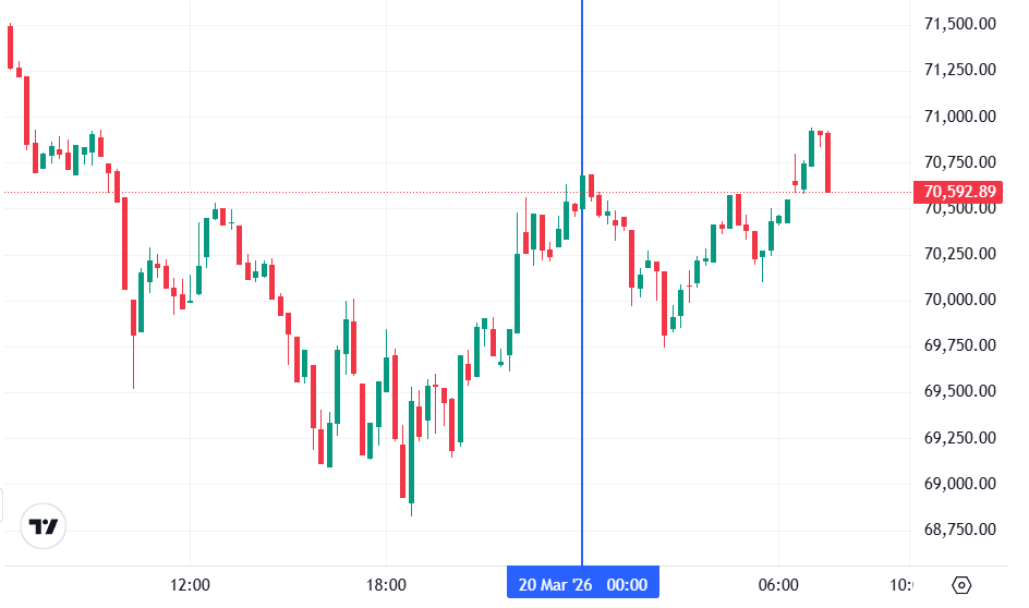 Биткоин (BTC), по данным ресурса TradingView, начал день с бокового движения. По состоянию на 07:42 (МСК), криптовалюта торгуется по $70 592 (1 токен в рублях — ₽6 092 576). Минимум биткоина за 24 часа — $68 805, максимум — $70 951.