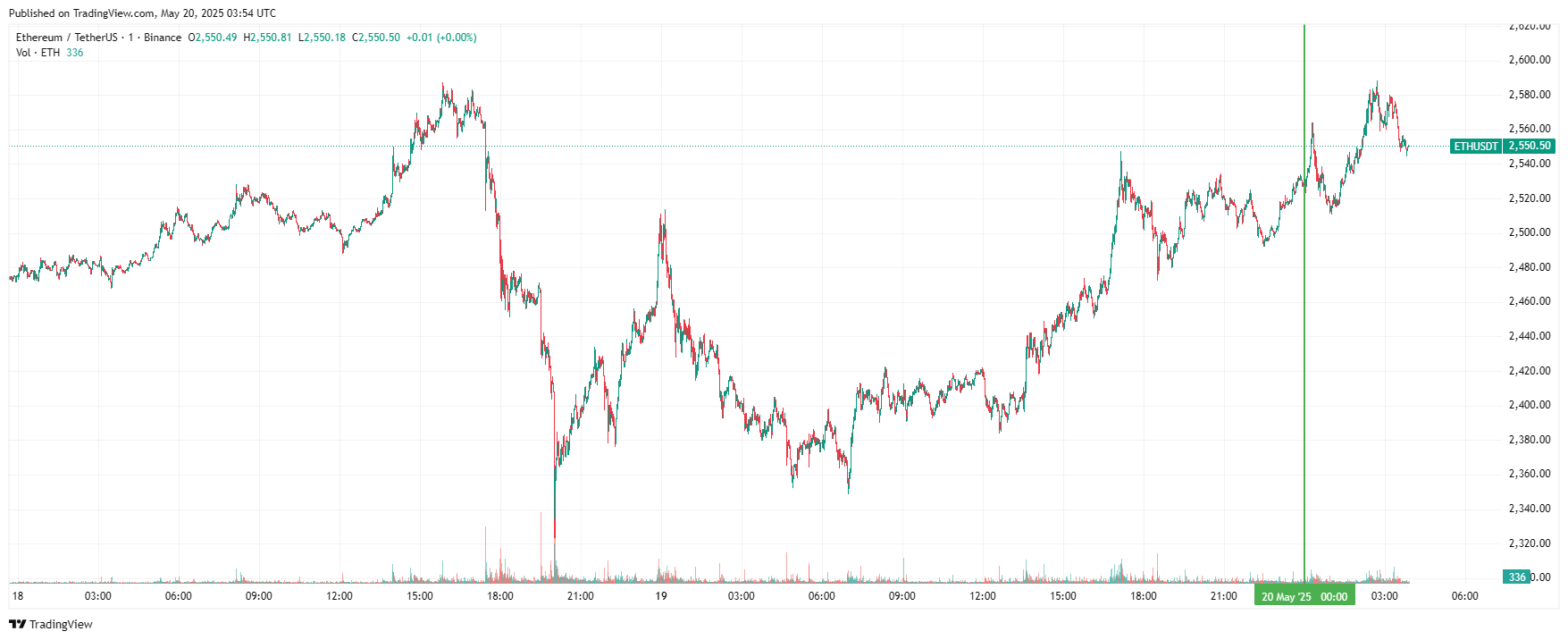 Вторая по капитализации криптовалюта Ethereum начала день с небольшого роста. На момент написания обзора, монета торгуется по $2 550 (1 токен в рублях — RUB 206 339).