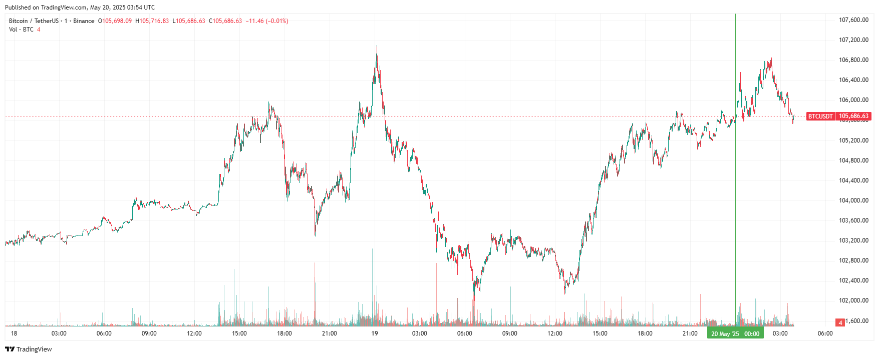 Биткоин (BTC), по данным ресурса TradingView, начал вторник с бокового движения. На момент написания обзора, 06:55 (МСК), криптовалюта торгуется по $105 686 (1 токен в рублях — RUB 8 541 497). Минимум биткоина за 24 часа — $102 112, максимум — $106 814.