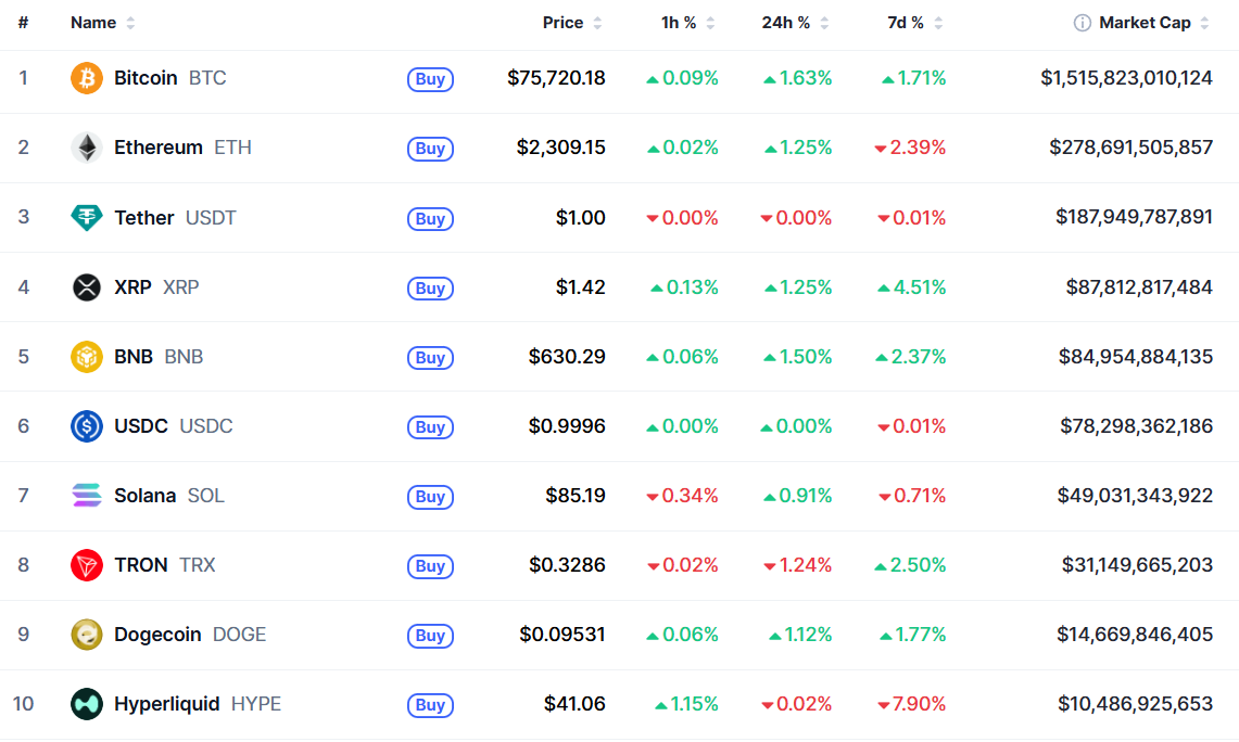 В топ-10 самых капитализированных криптовалют лучший результат за сутки — у биткоина (+1,63%), за неделю — у XRP (+4,51%). Наибольшие потери за 24 часа — у TRON (-1,24%), за семь дней — у Hyperliquid (-7,90%).