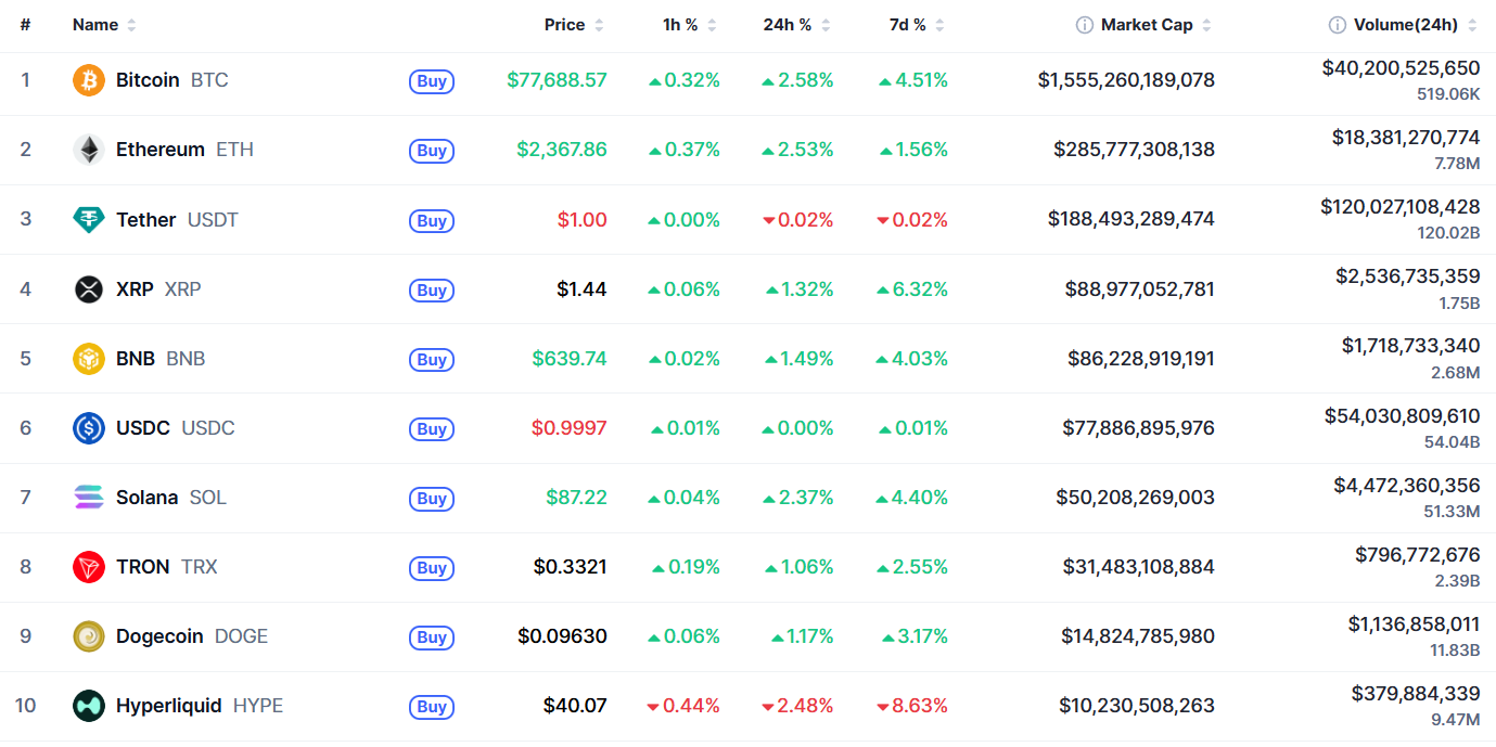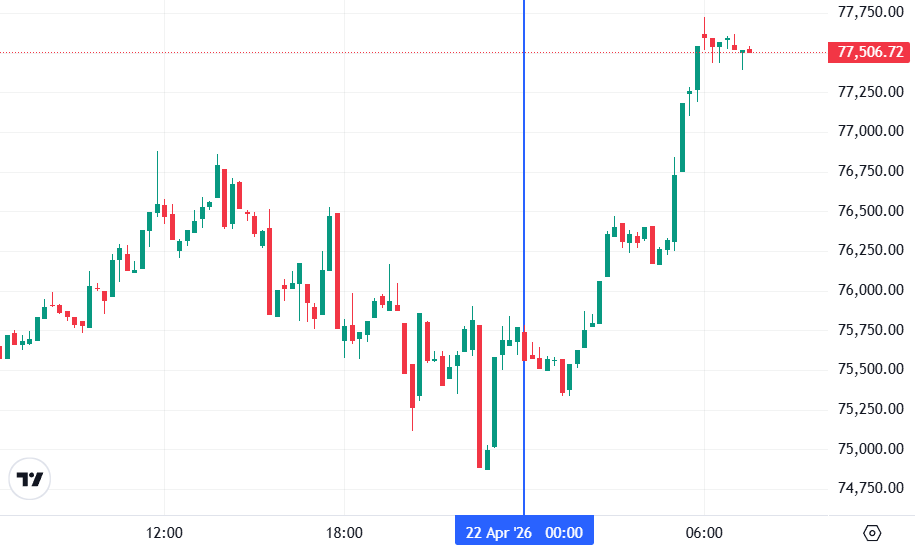 Биткоин (BTC), по данным ресурса TradingView, начал день с роста. По состоянию на 07:39 (МСК), криптовалюта торгуется по $77 506 (1 токен в рублях — ₽5 829 900). Минимум биткоина за 24 часа — $74 852, максимум — $77 726.