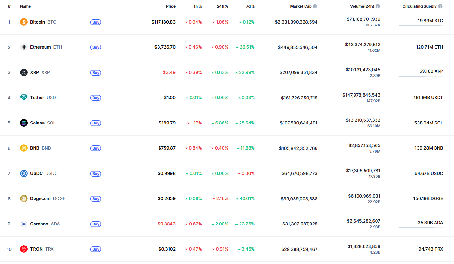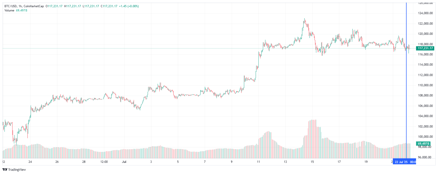 Биткоин (BTC), по данным ресурса TradingView, начал вторник с бокового движения. На момент написания обзора, 07:03 (МСК), криптовалюта торгуется по $117 231 (1 токен в рублях — ₽9 164 765). Минимум биткоина за 24 часа — $116 233, максимум — $119 671.
