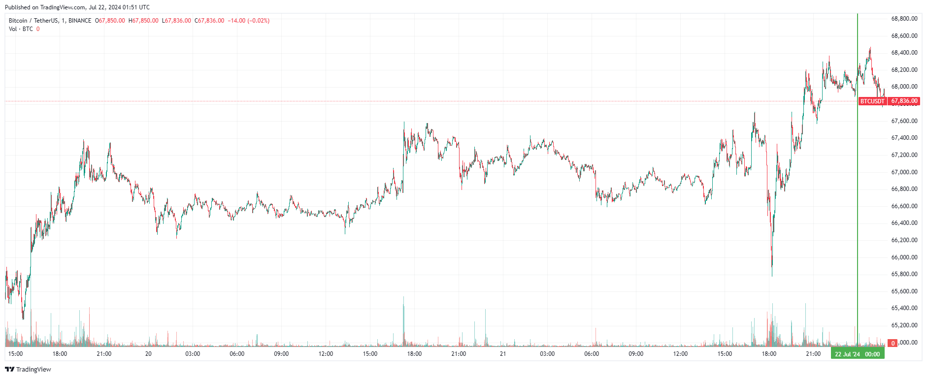 Биткоин (BTC), по данным ресурса TradingView, начал понедельник с роста, за которым последовала коррекция. По состоянию на 04:52 (МСК), криптовалюта торгуется по $67 836 (1 токен в рублях — ₽5 967 063). Минимум биткоина за 24 часа — $65 842, максимум — $68 480.