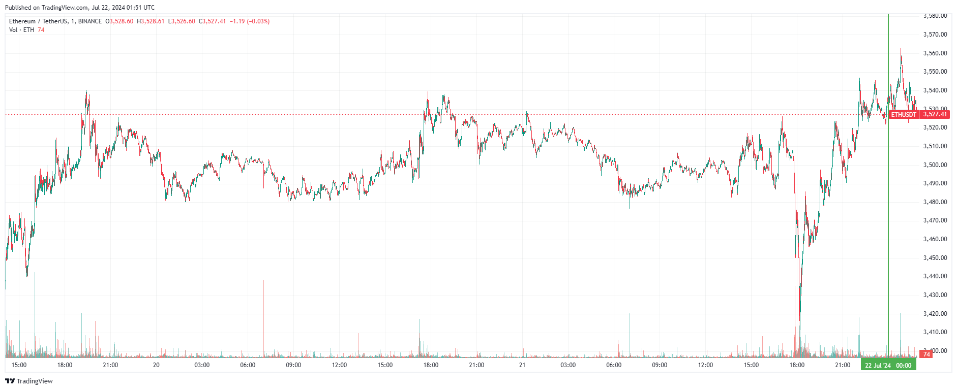 Вторая по капитализации криптовалюта Ethereum также начала день с роста с последующим восстановлением. По состоянию на момент написания обзора, монета торгуется по $3 527 (1 токен в рублях — ₽310 209).