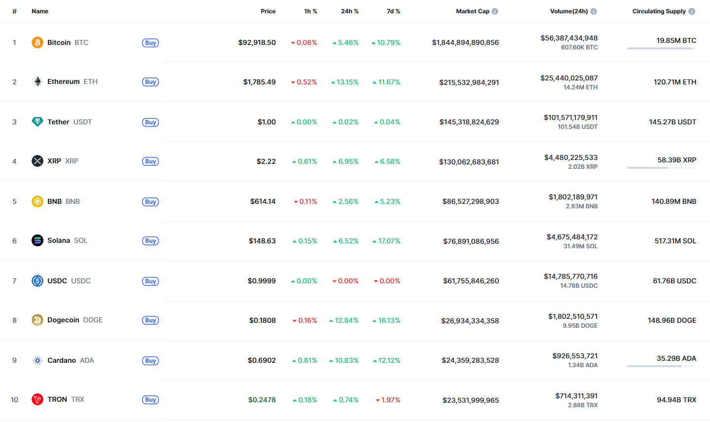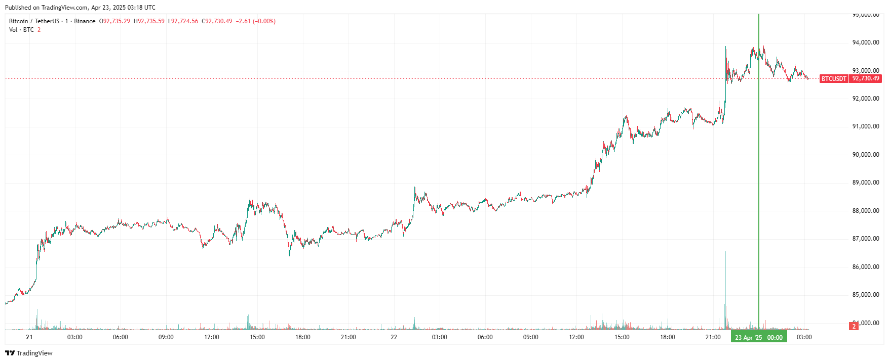 Биткоин (BTC), по данным ресурса TradingView, начал среду с небольшого снижения после обновления локального максимума. По состоянию на 06:27 (МСК), криптовалюта торгуется по $92 730 (1 токен в рублях — RUB 7 577 550).