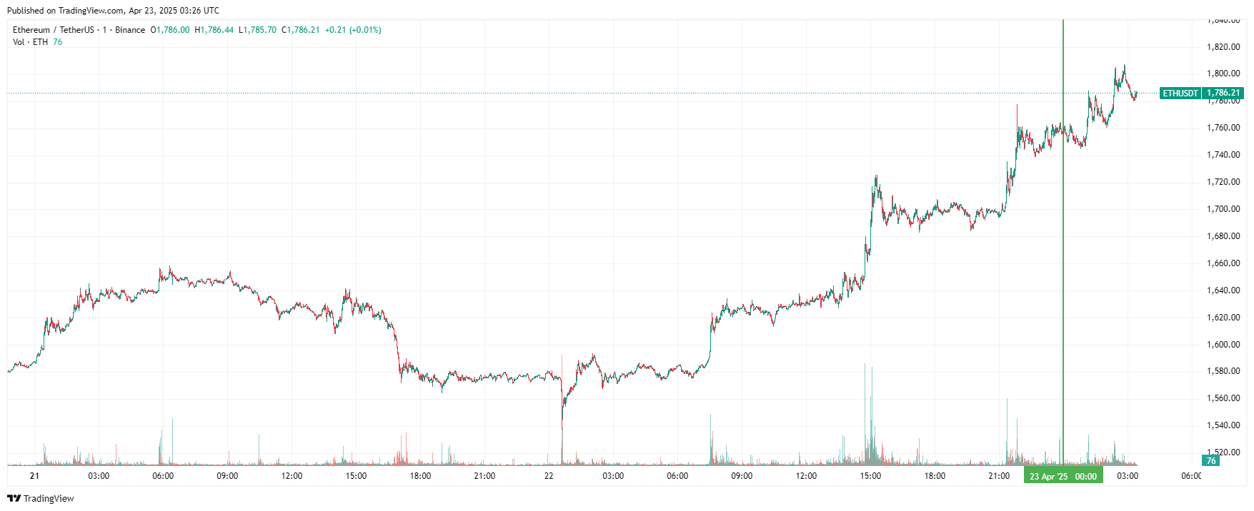 Вторая по капитализации криптовалюта Ethereum начала день с роста. По состоянию на момент написания обзора, монета торгуется по $1 786 (1 токен в рублях — RUB 145 653).