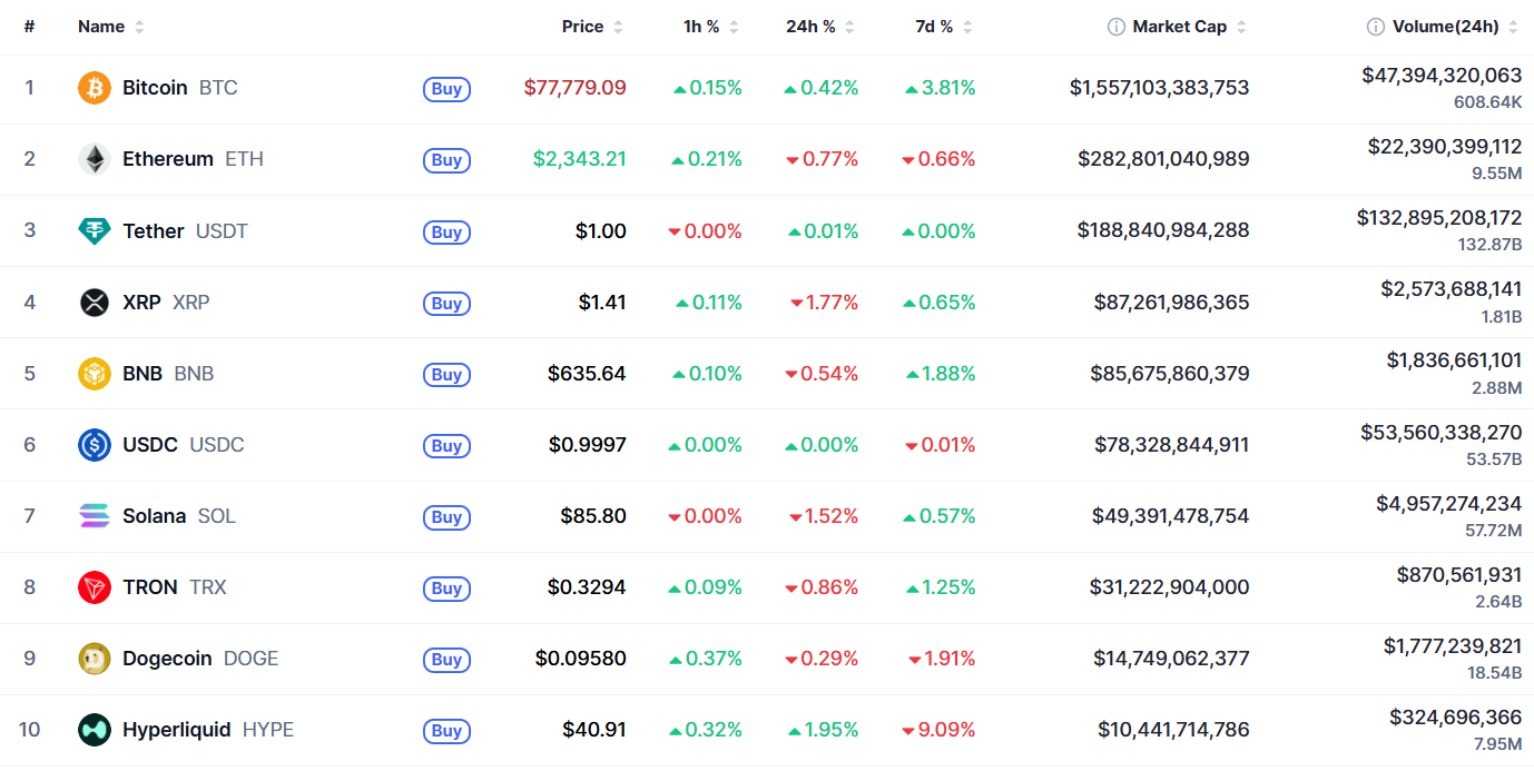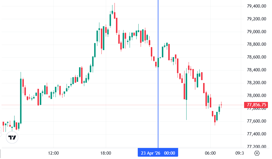 Биткоин (BTC), по данным ресурса TradingView, начал день с падения. По состоянию на 07:25 (МСК), криптовалюта торгуется по $77 856 (1 токен в рублях — ₽5 852 023). Минимум биткоина за 24 часа — $77 392, максимум — $79 468.