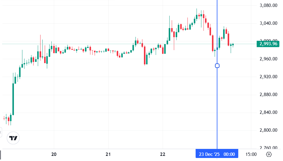 Вторая по капитализации криптовалюта Ethereum также начала день с бокового движения. По состоянию на момент написания обзора, монета торгуется по $2 993 (1 токен в рублях — ₽235 575).