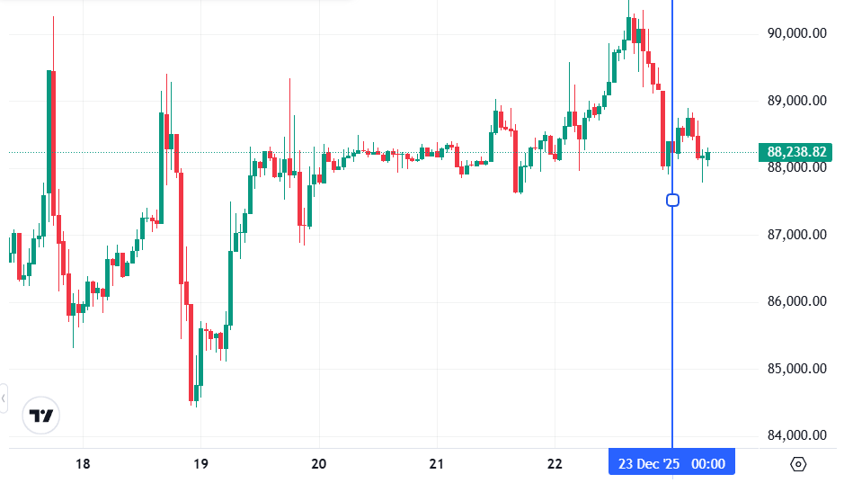 Биткоин (BTC), по данным ресурса TradingView, начал вторник с бокового движения. По состоянию на 07:27 (МСК), криптовалюта торгуется по $88 238 (1 токен в рублях — ₽6 942 795). Минимум биткоина за 24 часа — $87 789, максимум — $90 501.