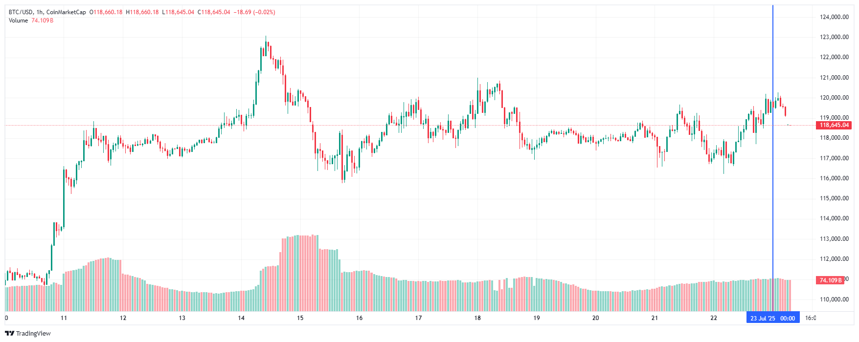 Биткоин (BTC), по данным ресурса TradingView, начал среду с небольшого снижения. На момент написания обзора, 07:02 (МСК), криптовалюта торгуется по $118 645 (1 токен в рублях — ₽9 314 857). Минимум биткоина за 24 часа — $116 611, максимум — $120 269.