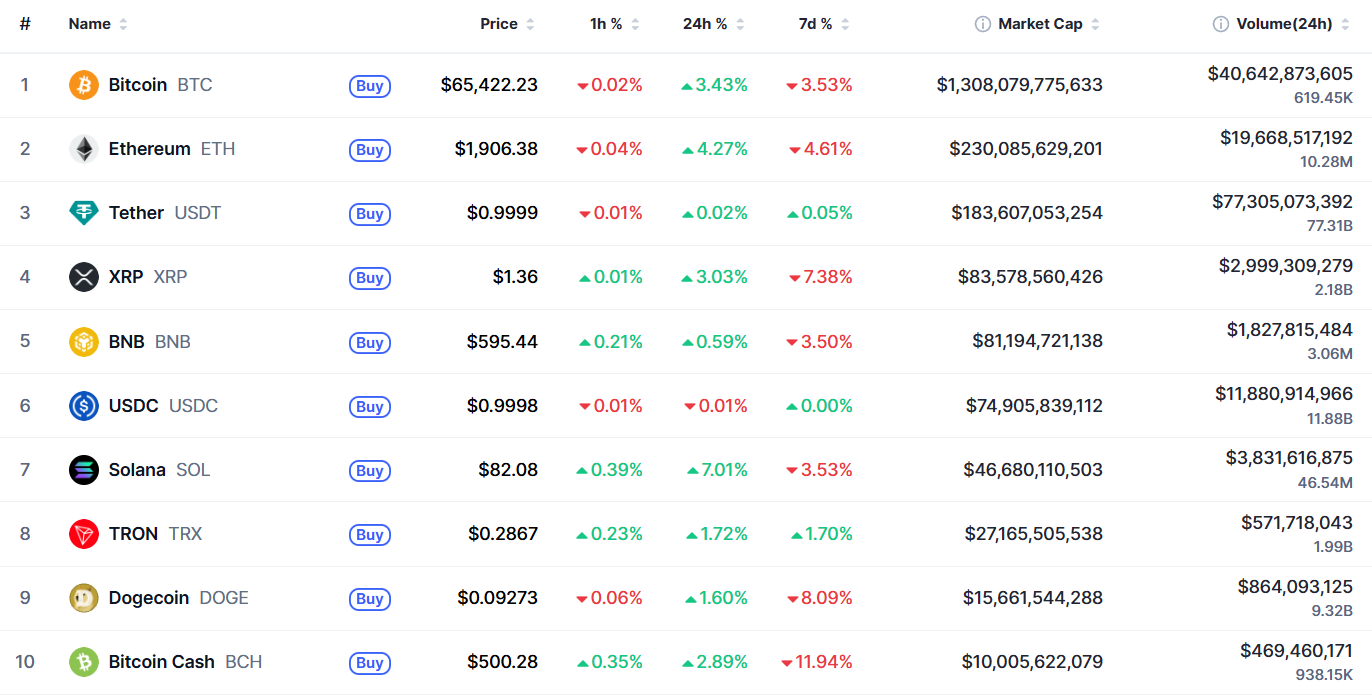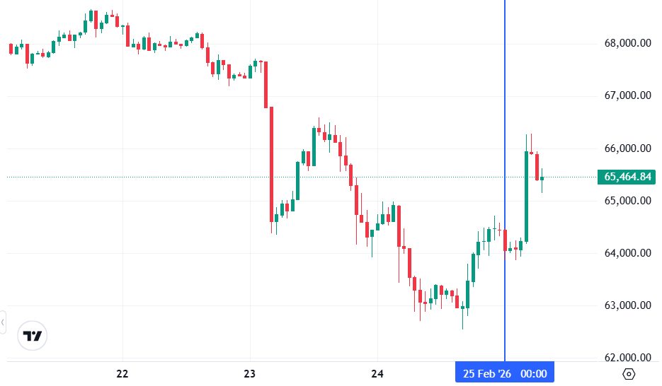 Биткоин (BTC), по данным ресурса TradingView, начал день с роста. По состоянию на 07:55 (МСК), криптовалюта торгуется по $65 464 (1 токен в рублях — ₽5 010 144). Минимум биткоина за 24 часа — $62 553, максимум — $66 284.