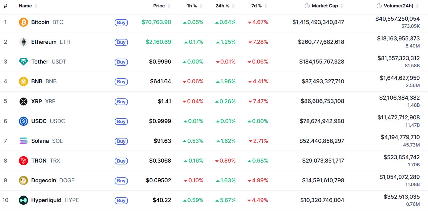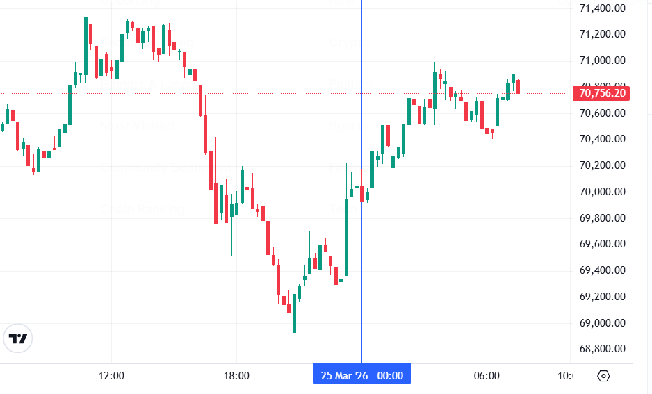 Биткоин (BTC), по данным ресурса TradingView, начал день с бокового движения. По состоянию на 07:41 (МСК), криптовалюта торгуется по $70 756 (1 токен в рублях — ₽5 694 055). Минимум биткоина за 24 часа — $68 920, максимум — $71 371.