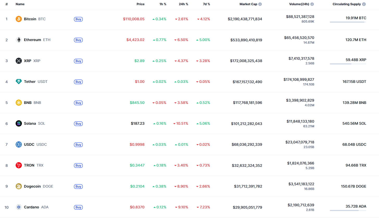 В топ-10 самых капитализированных криптовалют все монеты, за исключением стейблкоинов, дешевели в течение 24 часов. Наибольшие потери за сутки — у Solana (-10,51%). При этом монета продемонстрировала лучший результат за неделю (+5,06%). Наибольшие потери за семь дней — у Cardano (-7,23%).