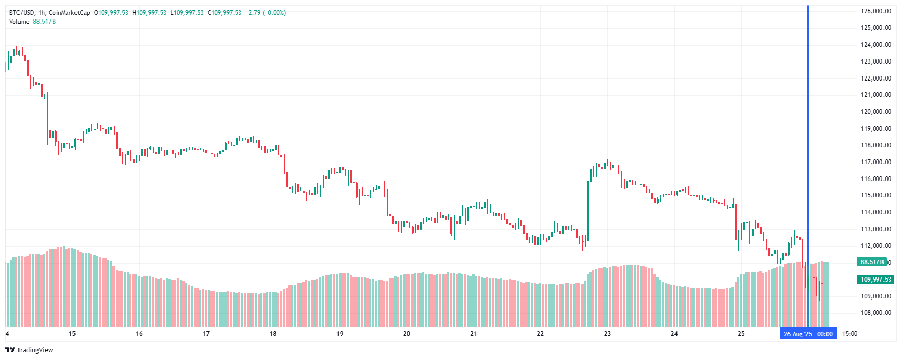 Биткоин (BTC), по данным ресурса TradingView, начал вторник с падения. На момент написания обзора, 07:06 (МСК), криптовалюта торгуется по $109 997 (1 токен в рублях — ₽8 886 025). Минимум биткоина за 24 часа — $108 762, максимум — $112 946.